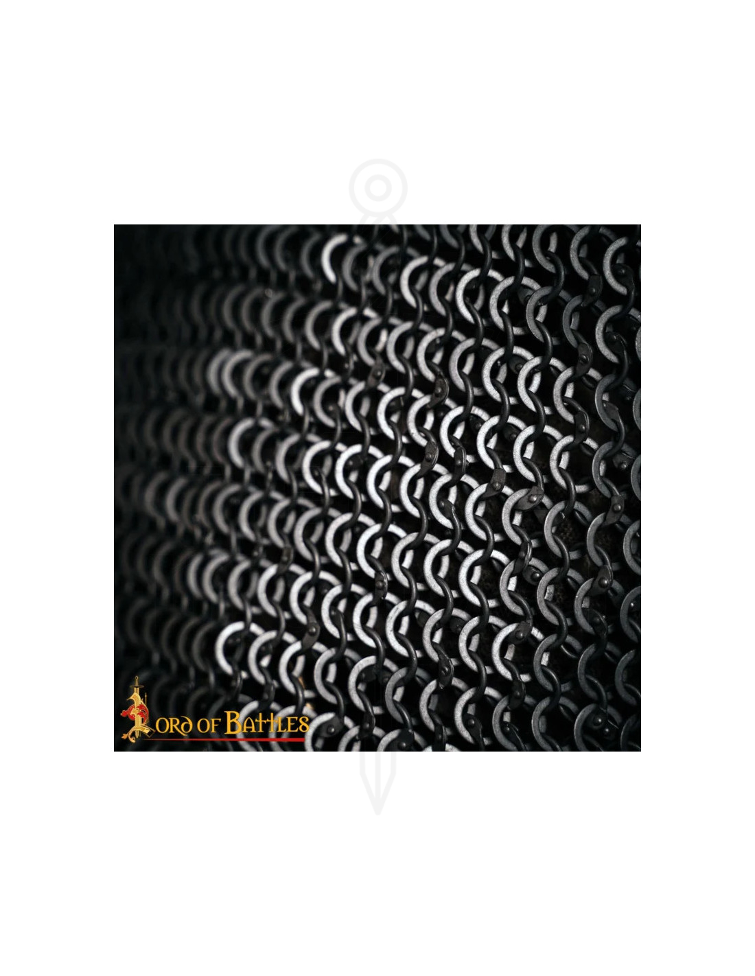 Nittet sortfarvet rund ringkædebrynje. Robuste 18 gauge RUNDE RINGE AF MILDT STÅL (ca. 9 mm i diameter), med skiftende flade ringe, er møjsommeligt KUPPENITTET af vores dygtige håndværkere. Det indviklede sammenlåsende mønster i et FIRE I ET-mønster sikrer beskyttelse mod overraskende angreb.