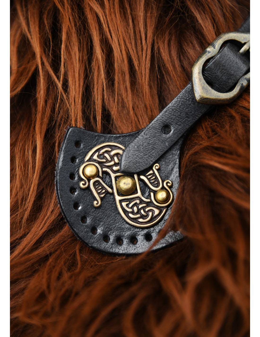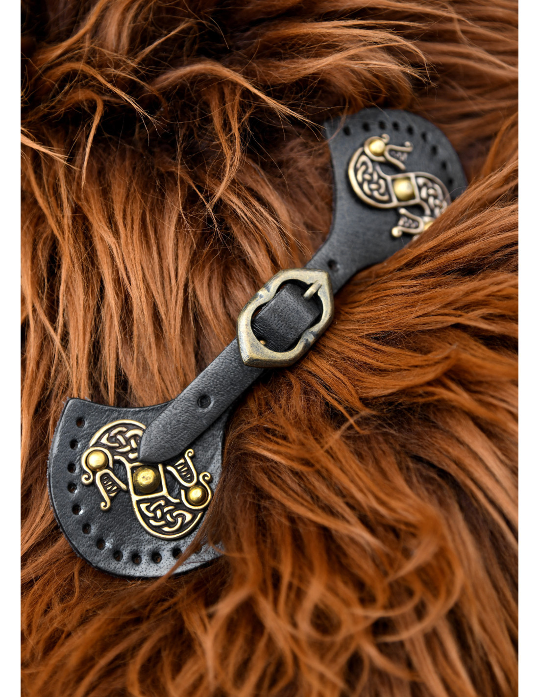 Tilgængelig i brun og sort, den middelalderlige Leather Cloak Closure Dragons-model tilpasser sig perfekt til ethvert outfit og tilføjer en raffineret og autentisk finish. Denne lukning er ideel til historiske reenactments, temabegivenheder eller blot for dem, der ønsker et karakteristisk og autentisk look, og er det perfekte supplement til enhver middelalderlig beklædningsgenstand.