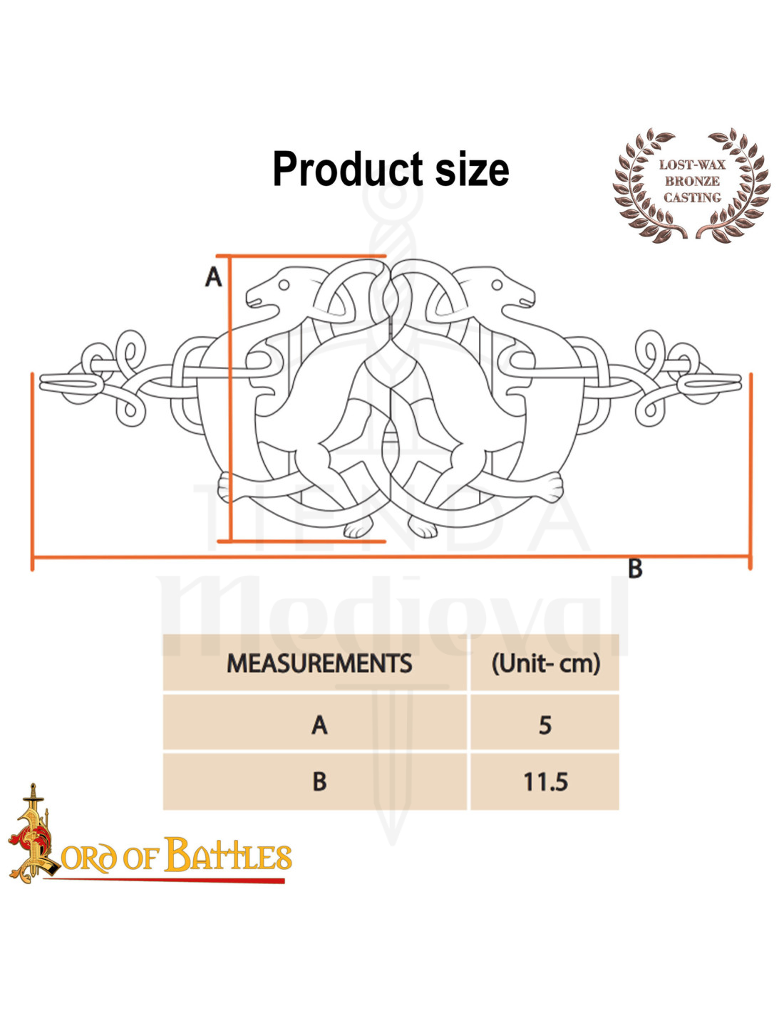 Med et keltisk motiv af sammenflettede hjorte, hvor figurerne står overfor hinanden, og det forarbejdede knudemønster udstråler bevægelse og elegance, mens linjerne, der simulerer tekstur, minder om huden og det stiliserede pels af gamle middelalderlige stykker. På billedet intensiverer den matte glans af bronzen mod et bordeaux stof dens tilstedeværelse, hvilket gør, at den træder frem selv i alvorlige scener.