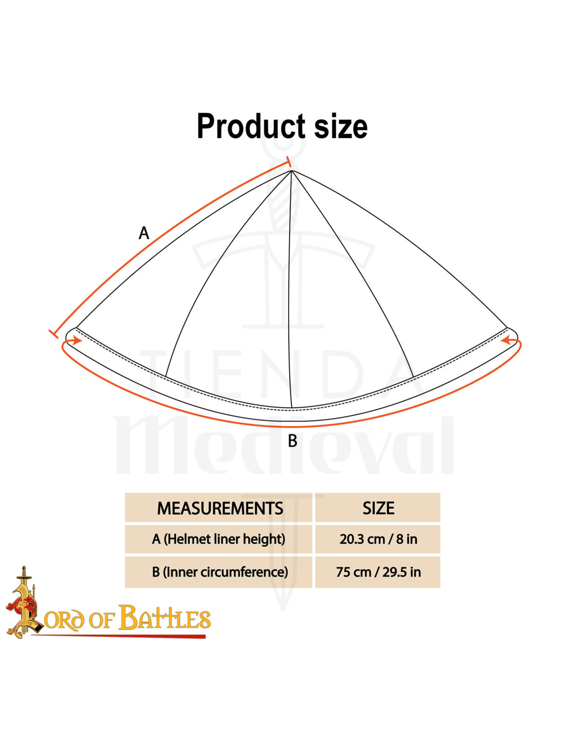 Perfekt til at bære alene i rekreationer eller fungere som indvendig foring af hjelme til LARP, HEMA eller teaterproduktioner, dette produkt fremstilles i hånden, så hver enhed kan have små variationer, der tilføjer karakter og autenticitet.