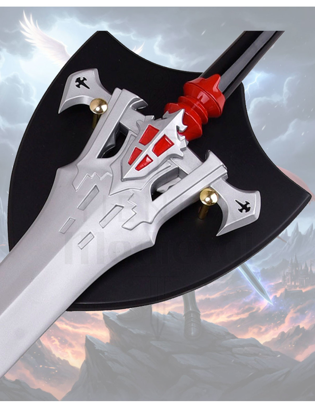 Invictus sværd fra Clive Rosfield - Final Fantasy serie ankommer som dette imponerende stykke, designet til dem, der ønsker en udstilling med tilstedeværelse, autenticitet og nem montering. Dets blad i en gråhvid tone og det sølvfarvede grip med udskæringer giver et kraftfuldt visuelt indtryk, mens det sølvfarvede pommel og det røde greb med sorte striber tilføjer kontrast og personlighed i forgrunden.