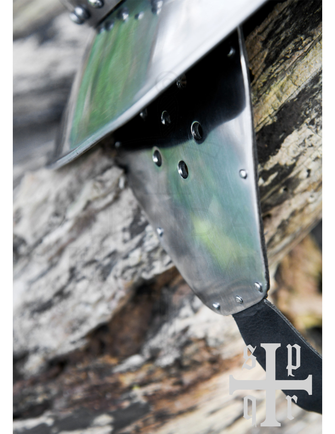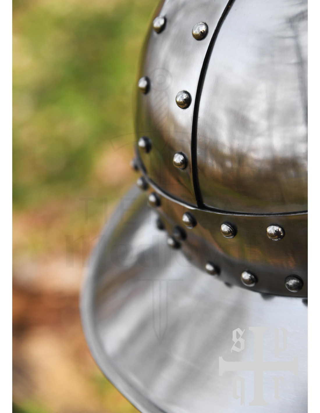 Denne hjelm, inspireret af de eksemplarer, der er afbildet i manuskripter som Codex Hardenbergianus, er omhyggeligt håndlavet af stål af høj kvalitet. Dens brede skygge på 6,5 cm giver en fremragende beskyttelse mod nedadgående slag og projektiler, uden at det går ud over bærerens syn, hørelse eller vejrtrækning. De artikulerede kindbeskyttere tilføjer et ekstra lag af sikkerhed.