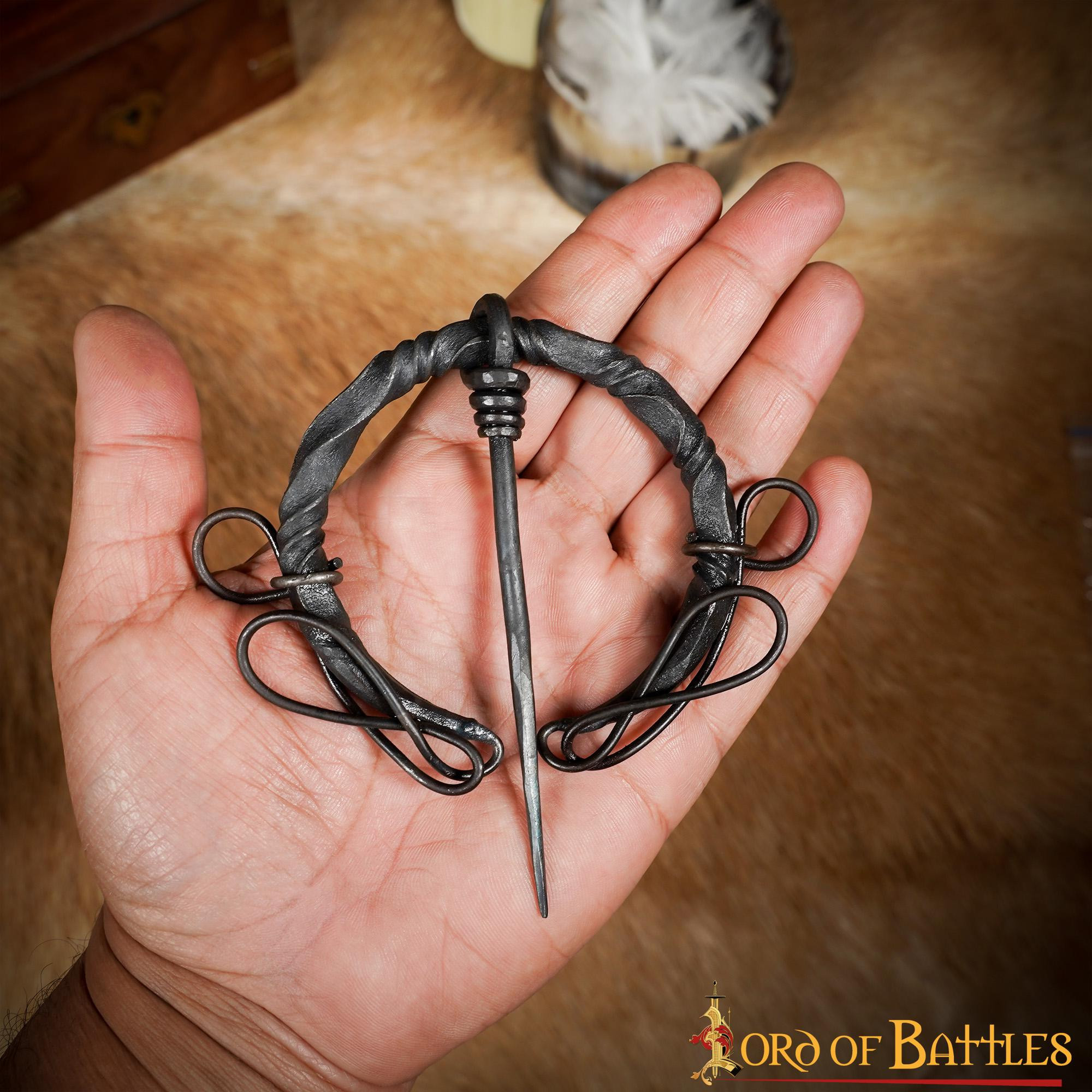 Oplev elegance og historie med denne keltiske smedejernsfibula med knuder. Hver detalje i denne broche er dygtigt håndsmedet af stærkt SOLID IRON, hvilket sikrer holdbarhed og enestående kvalitet. De elegante metalknuder giver den et unikt og sofistikeret touch.