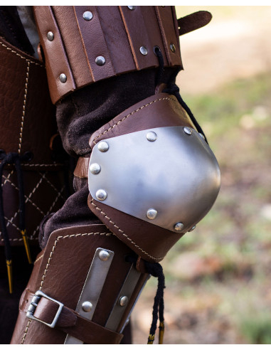 Kombinationen af robust brunt læder med nittede metalforstærkninger beskytter albueleddet, mens den segmenterede konstruktion følger hver armbevægelse, så du kan kæmpe, klatre eller patruljere uden at føle rustningen som en barriere. Den ergonomiske afslutning ved albuen fordeler stød, hvilket giver tryghed i krævende situationer og komfort under lange dage.