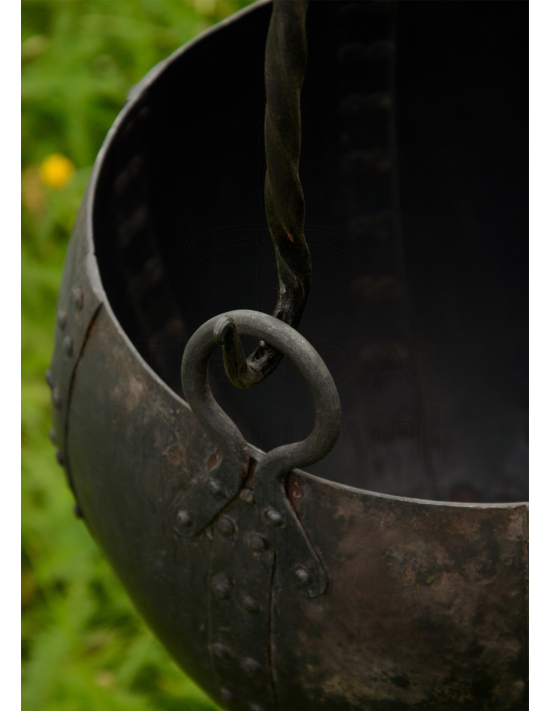 Et alsidigt stykke, der passer perfekt ind i forskellige historiske perioder takket være sin solide konstruktion og sin mørke, ældede æstetik, fremhævet af synlige nitter og den håndlavede tekstur, der vækker minder om tidernes opdagelsesrejsende og eventyrere. Denne gryde er ikke blot et køkkenredskab, men et arv, der tilføjer karakter til dit hjem og fungerer som et fremragende valg for både historieentusiaster og dem, der værdsætter den typiske håndlavede kvalitet.