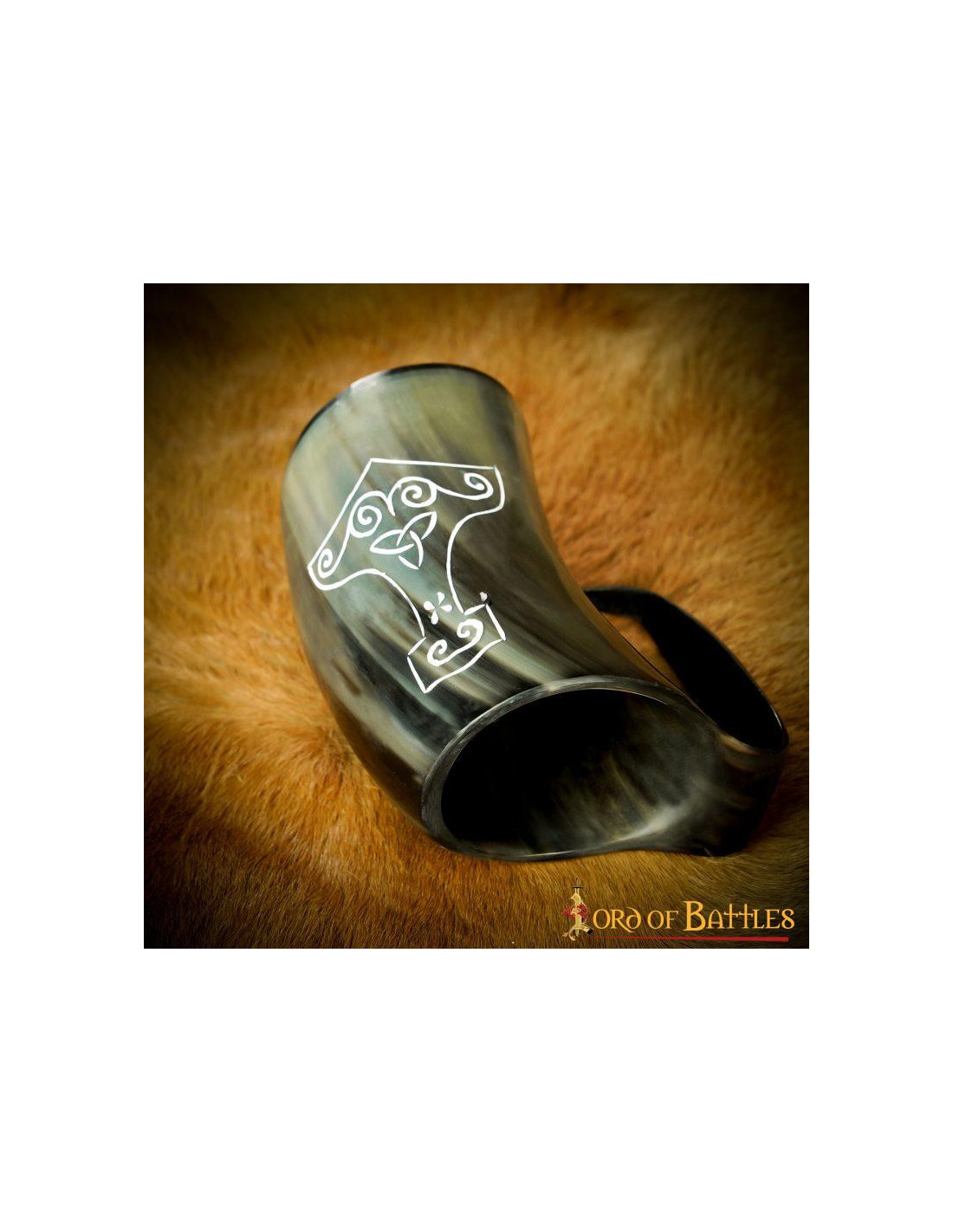 Oplev det autentiske håndlavede vikingeølkrus Mjolnir! Denne imponerende ceremonielle tankard er designet til at tilfredsstille den ægte tørstige kriger. Med en kapacitet på cirka 600 ml kan du nyde din yndlingsøl som en ægte viking.