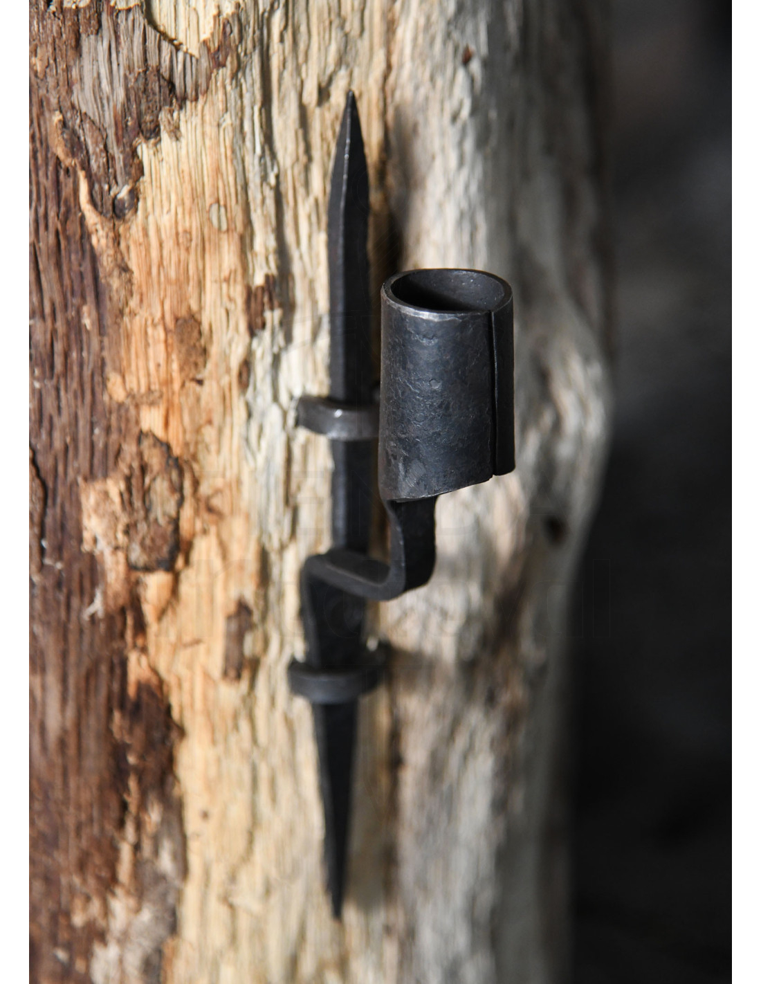 Med et design inspireret af middelalderlige smedjer og omhyggeligt udført i ét stykke jern, skiller denne holder sig ud ikke kun for sin håndværksmæssige skønhed, men også for sin alsidighed. Du kan fastgøre den sikkert til væggen med de to metalbeslag, den inkluderer, eller tilpasse dens spidse ender til direkte at spidde den i bjælker eller vægge, hvilket giver en naturlig og robust fastgørelse. På den måde kan du skabe en varm atmosfære i ethvert hjørne med et tændt lys, og dermed skabe en hyggelig og historisk stemning.