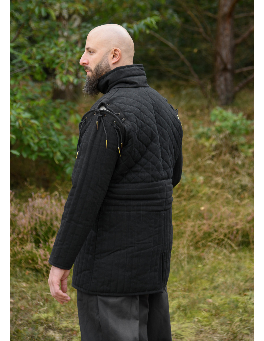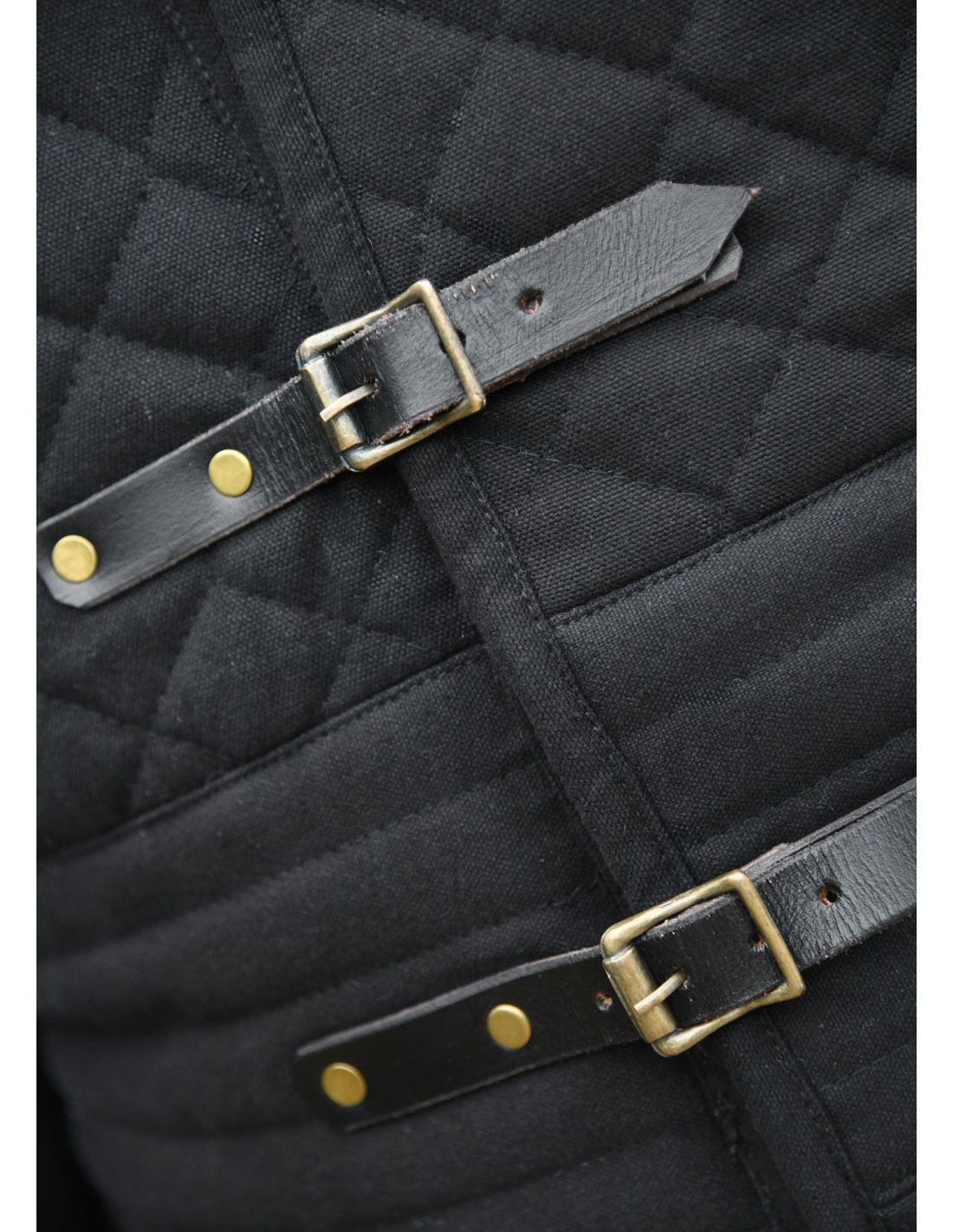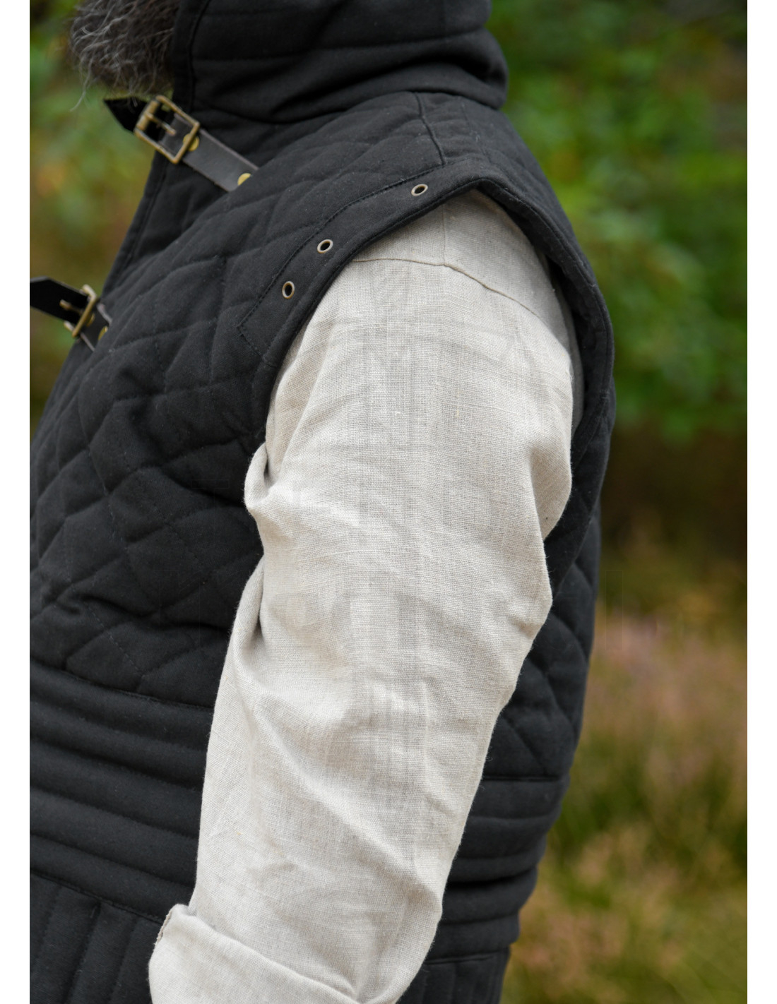 Denne sorte gambeson fra Ulfberth kombinerer styrke, stil og funktionalitet, perfekt til historiske rekreationer, scenekamp eller samling. Designet med tre lag materiale inkluderer en robust ydre belægning af canvas bomuld, en indre polstring af polyester for maksimal stødabsorption og et indre for af bomuld, der sikrer komfort ved langvarig brug.