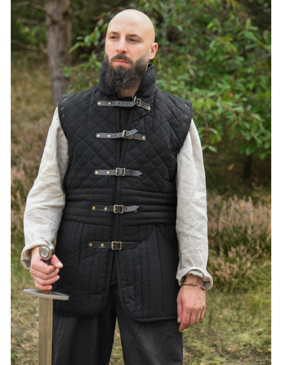 Designet i sort giver et sobert og elegant præg, ideelt for dem, der ønsker at skille sig ud med et klassisk touch i deres middelalderlige repræsentationer. Denne gambeson er et robust og stilfuldt valg, der kombinerer historie og kvalitet i hver detalje.