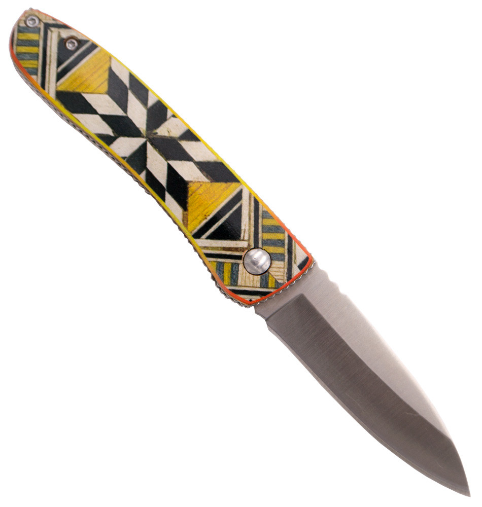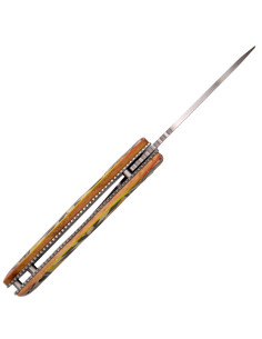 Håndtaget af bøgetræ, dekoreret med et 3D intarsia-print på begge sider, giver ikke kun et fast og behageligt greb, men også et kunstværk i dine hænder. Indlæg, en håndværksmæssig teknik, der leger med indlæg fra forskellige træsorter for at skabe indviklede mønstre, giver denne kniv et karakteristisk præg, der adskiller den fra enhver anden. Hvert præcist trykt mønster tilføjer et niveau af sofistikering, der gør denne kniv til meget mere end et værktøj.