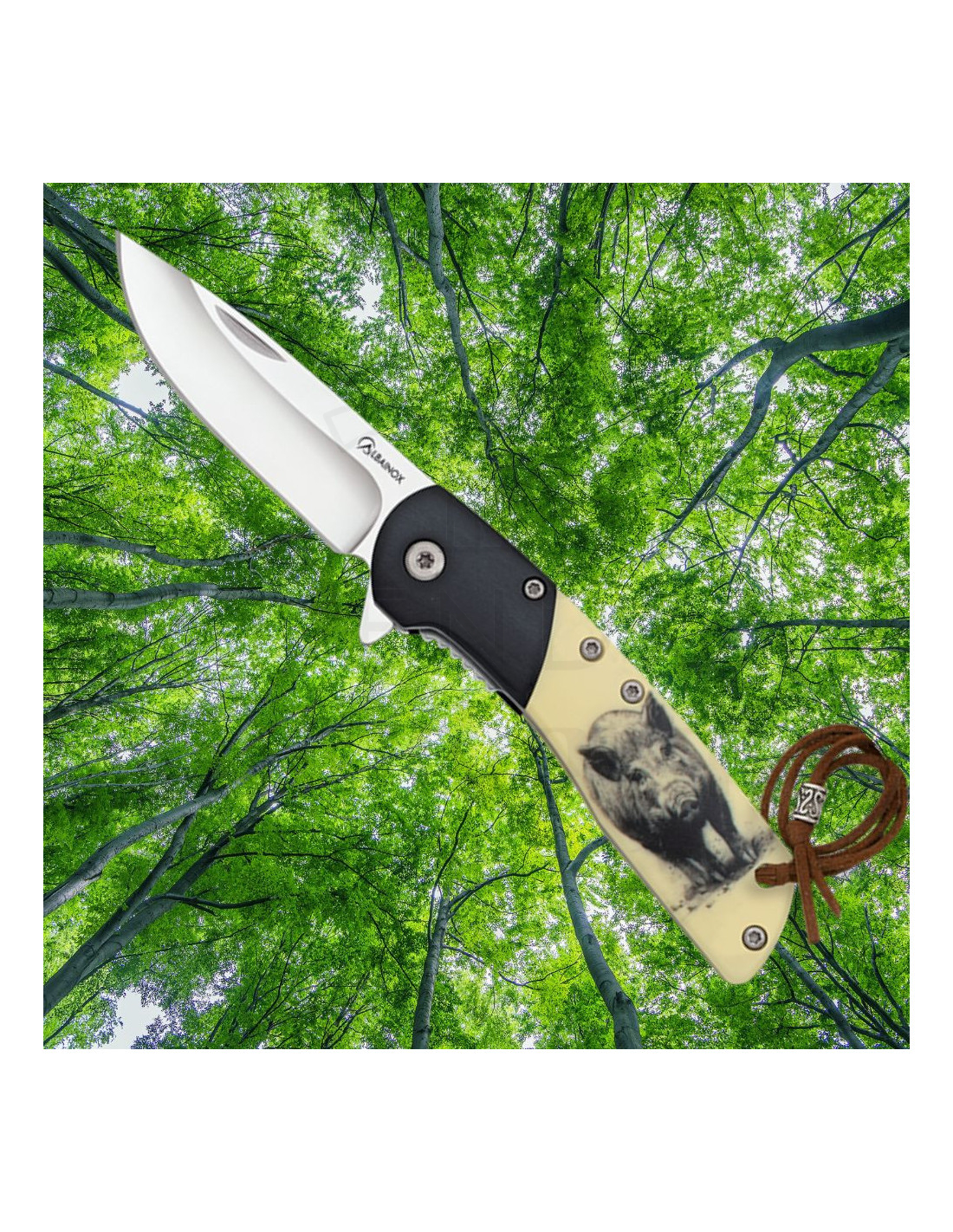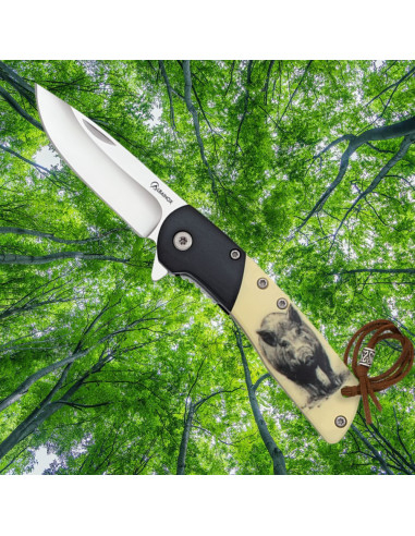 Med et blad fremstillet af stål 3CR13MOV sikrer den et præcist snit og langvarig modstand. Den satinfinish giver den et raffineret og professionelt udseende. Derudover kombinerer dens håndtag sort træ og ABS, hvilket giver et fast, behageligt og elegant greb. Den inkluderer en eksklusiv gravering af et vildsvin på grebet, en detalje der ikke kun fremhæver dens æstetik, men også giver den en unik karakter.
