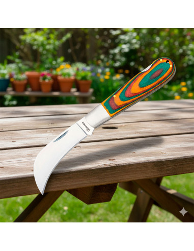 Det buede blad, fremstillet af 3Cr13Mov-stål med satinfinish, tilbyder fremragende holdbarhed og præcist snit, ideelt til forskellige opgaver som camping, fiskeri eller havearbejde. Takket være sit ergonomiske design sikrer det farvede træhåndtag ikke kun et livligt udseende, men også et behageligt og sikkert greb under brug.