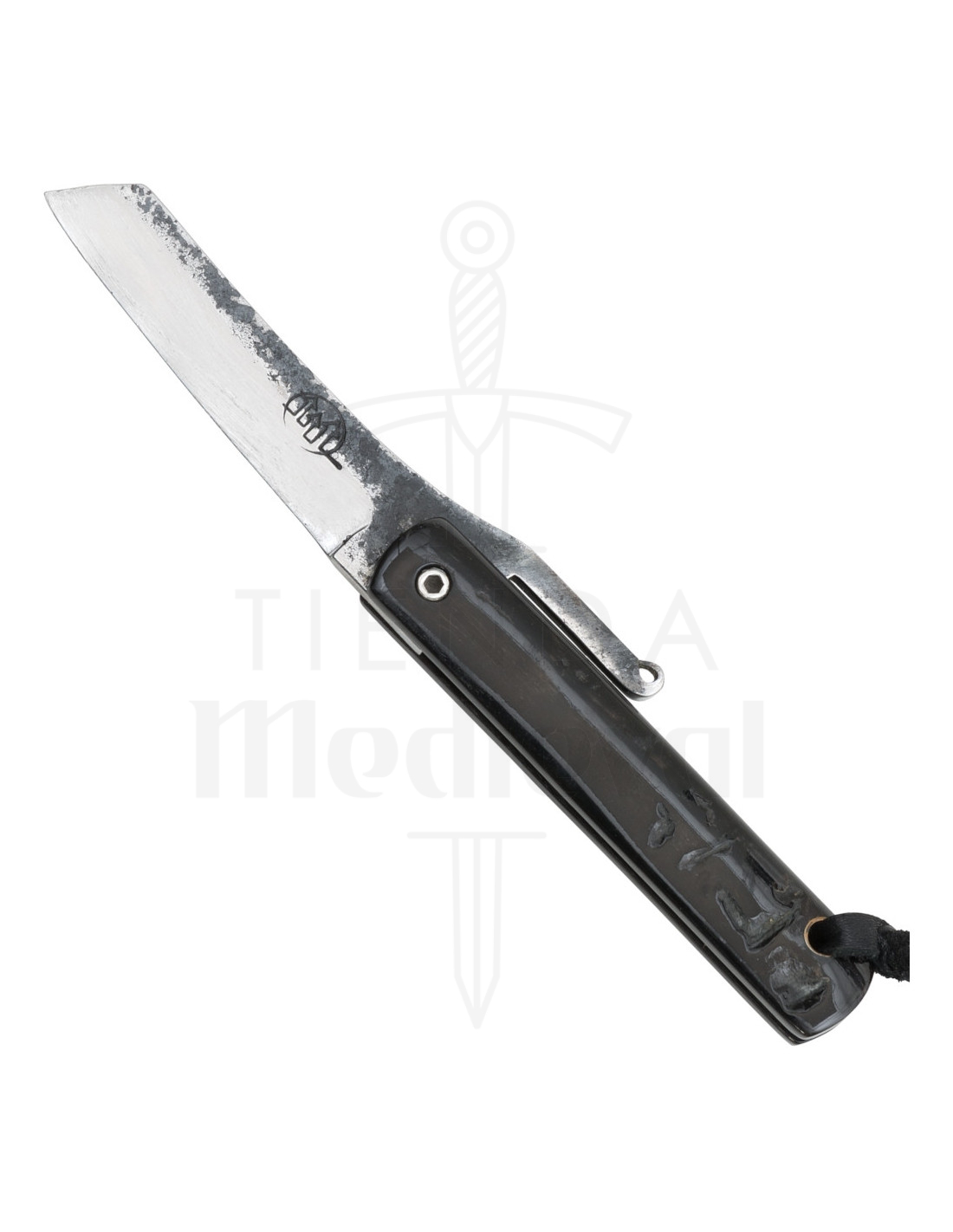 Kroppen, arbejdet ud fra et enkelt stykke horn, omhyggeligt bøjet og formet, giver et ergonomisk greb, der tilpasser sig hånden og vinder karakter med brug, takket være de naturlige variationer i materialet. Hver kniv viser et unikt mønster, hvilket gør hver enhed eksklusiv og visuelt tiltalende at bære i lommen.