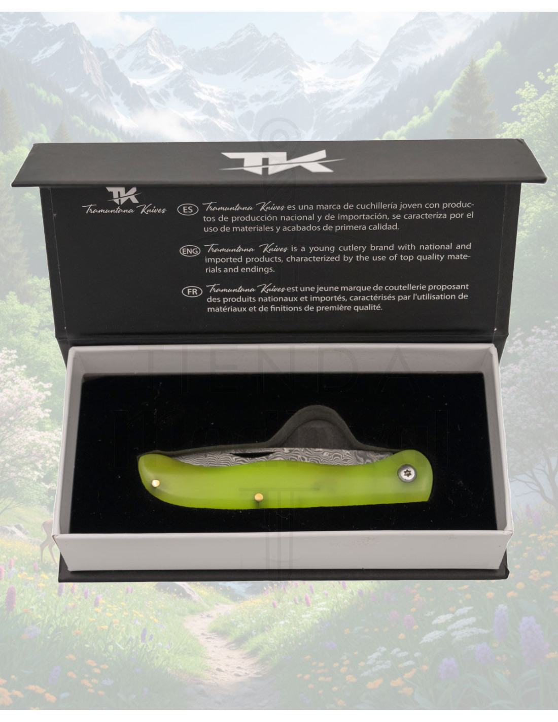 Håndtaget i fluorescerende grønning går ikke ubemærket hen, det ergonomiske design tilpasser sig hånden og forbedrer kontrollen under fine manøvrer; desuden gør den livlige farve det lettere at finde kniven straks, både i en skuffe og udendørs. Kombinationen af materialer sikrer et sikkert greb uden at give afkald på letvægt, for nem transport.