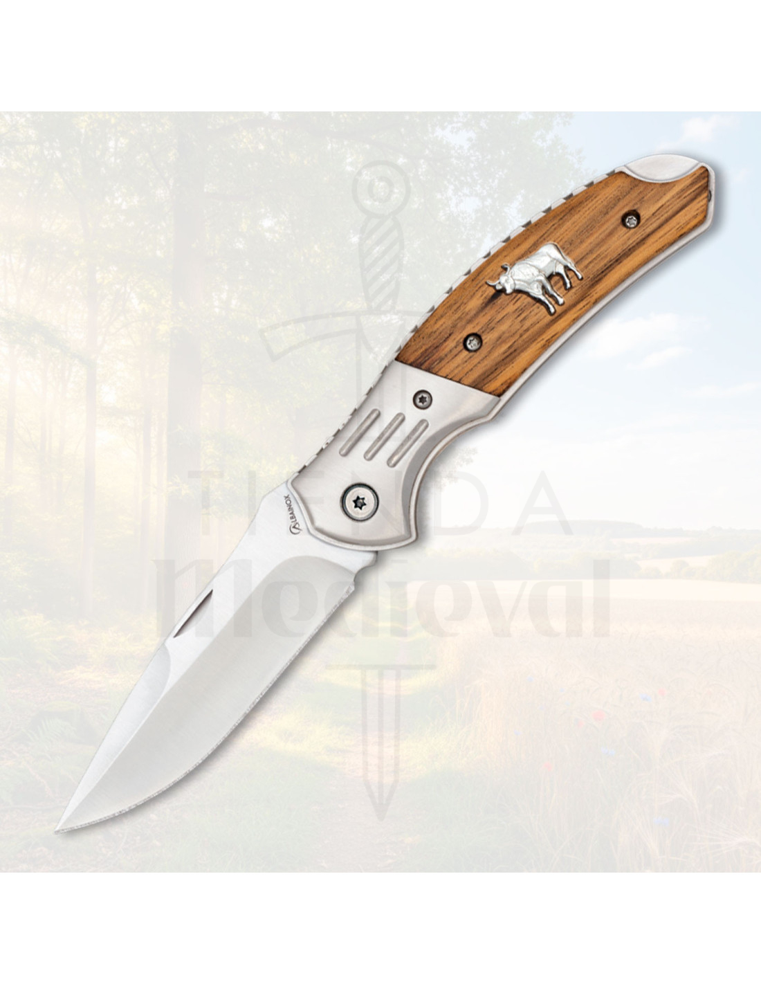 Den metalpynt, der er formet som en tyr, tilføjer karakter og personlighed, hvilket gør kniven til et fremtrædende stykke i enhver samling eller jagtudstyr. De synlige skruer og den metalliske samlede del udstråler robusthed, og den afrundede metaldel i enden hjælper med at balancere helheden under brug.