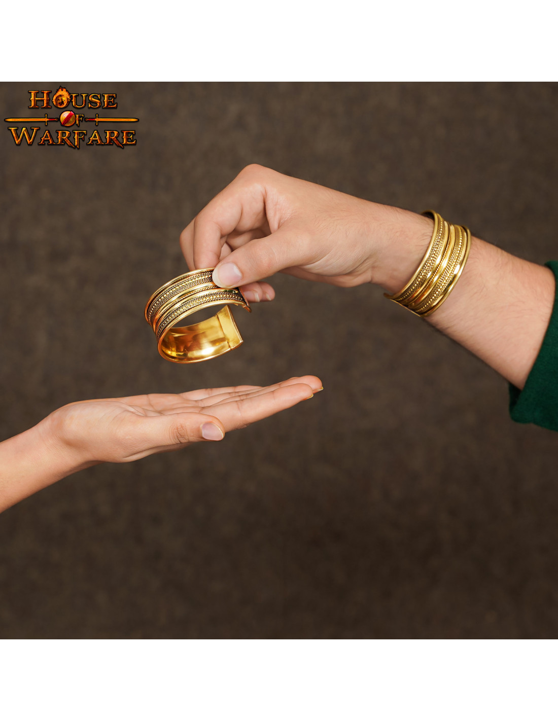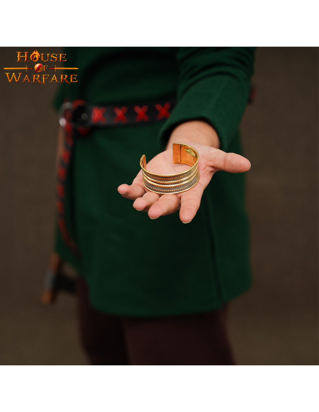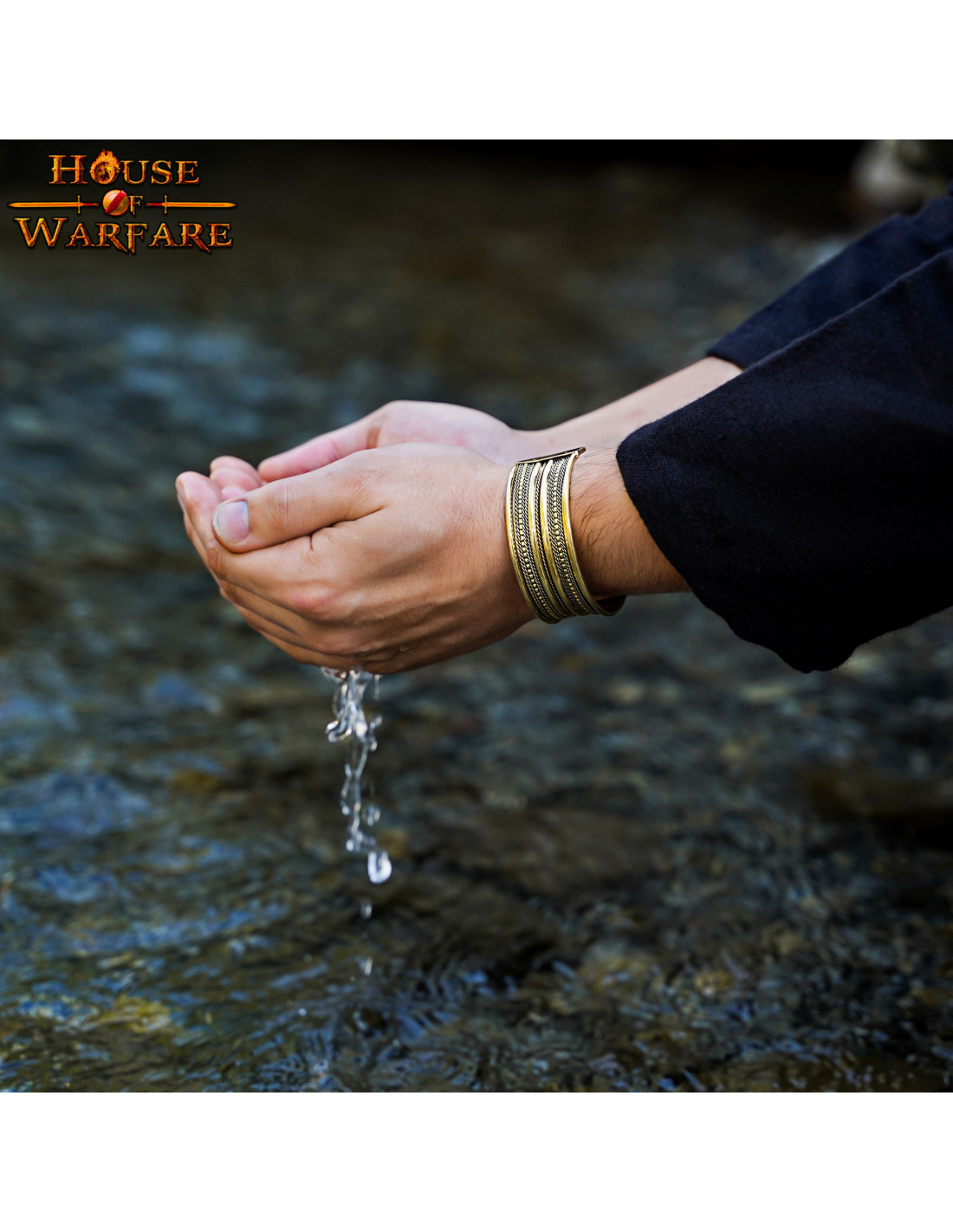 Er du historieelsker og fascineret af middelalderen? Så er dette middelalderlige messingarmbånd lige noget for dig. Dette imponerende tilbehør er lavet af messing af høj kvalitet, hvilket giver det et robust og autentisk udseende. Dens design er alsidig og kan tilpasses enhver anden tidsalder, så du kan bruge den til forskellige lejligheder og tematiske begivenheder.
