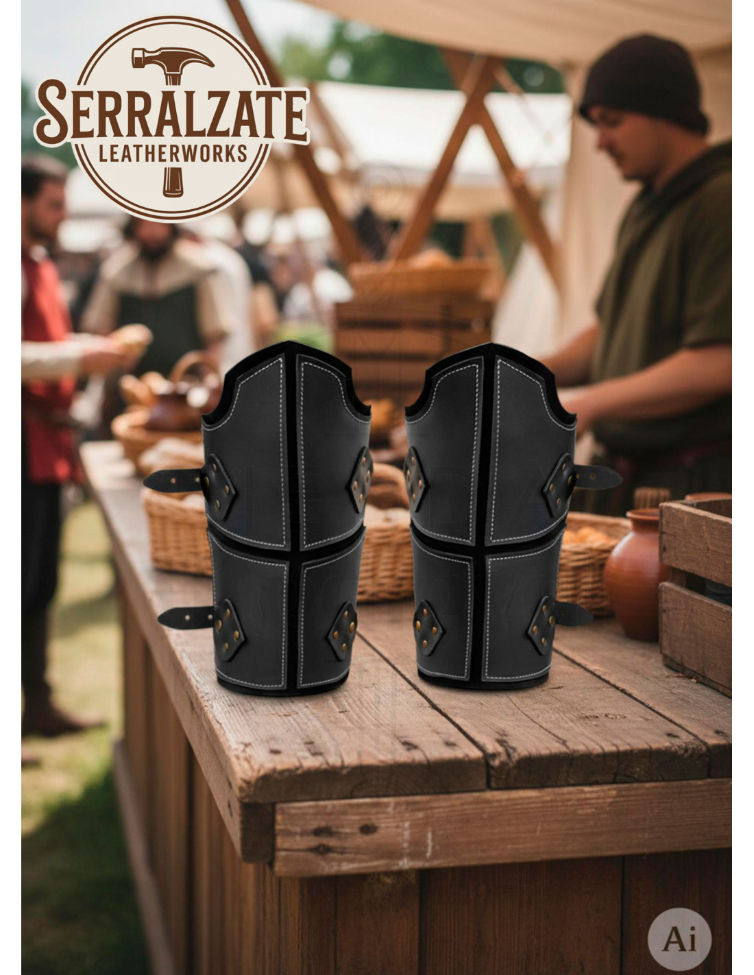 Lavede i ægte sort læder, præsenterer de en glat finish og et håndværk, der taler for sig selv, med hvide syninger, der skaber et plettet mønster og forstærker de mest udsatte områder, hvilket giver en følelse af modstandskraft og karakter fra første gestus. Deres konstruktion i flere stykker tilpasser sig underarmen, hvilket giver et fast greb uden at begrænse bevægelserne, ideel til historiske rekreationer, cosplay eller temaevenementer, hvor mobilitet og udseende betyder alt.