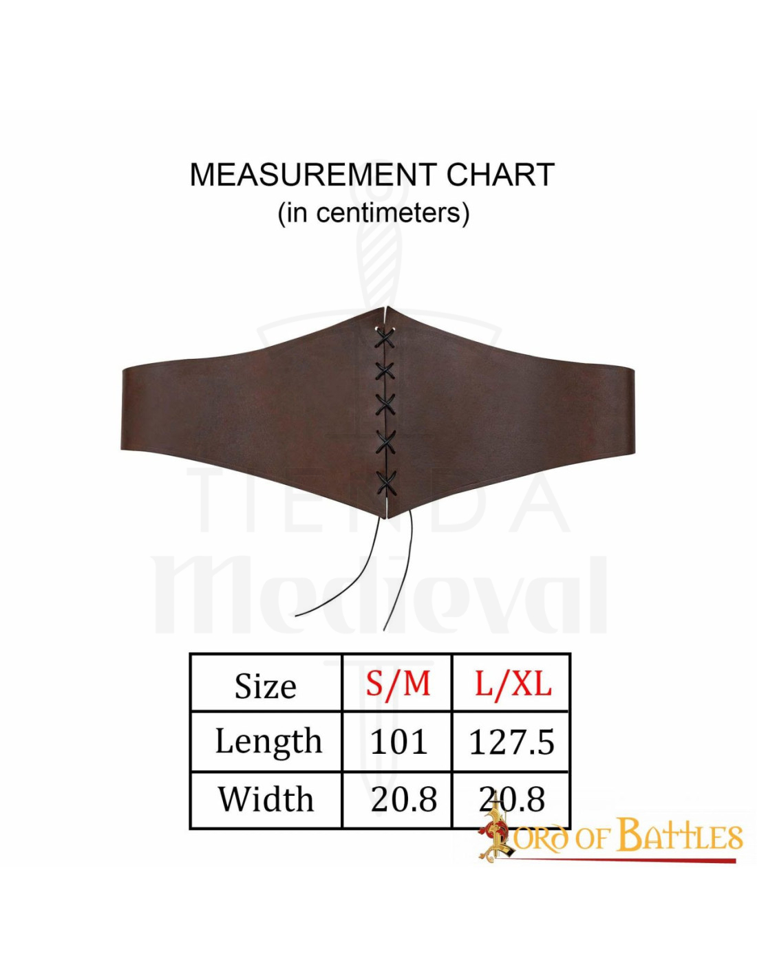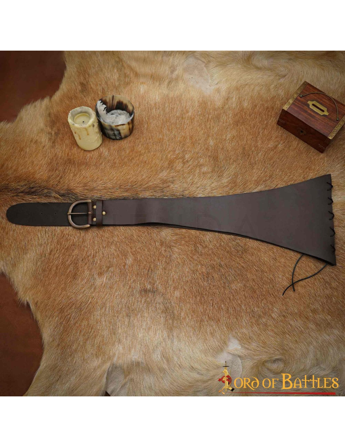 Denne brede design, der udvider sig i midten og snævrer ind mod enderne, fremhæver silhuetten og giver støtte, hvor det er mest nødvendigt, samtidig med at det giver frihed til bevægelse i dynamiske handlinger. Det glatte læder med mat finish giver et seriøst og pænt udseende, der tilføjer autoritet til dit outfit uden forstyrrende glans, perfekt til kamp scener og til at komplementere rustikke eller tidsbestemte kostumer.