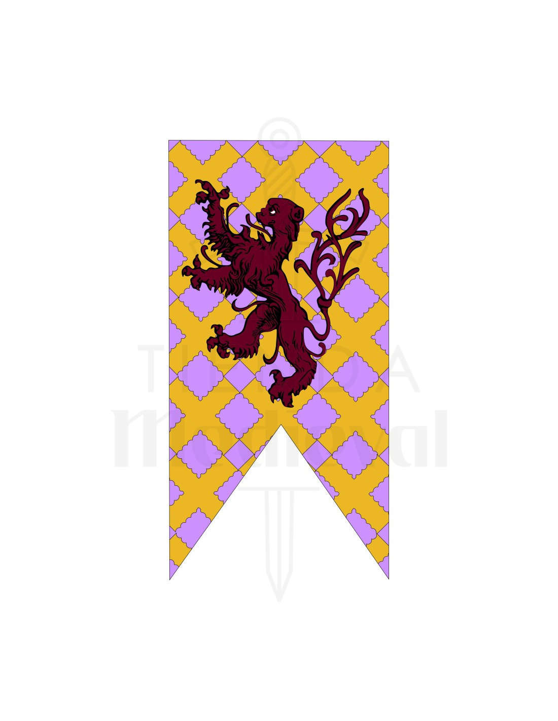 søger du en iøjnefaldende måde at vise din stolthed og middelalderlige stil på? Dette dekorative banner tager dig direkte tilbage til riddernes og slottenes æra, men med et moderne og livligt præg. Med et design, der kombinerer gule og lilla nuancer i et diamantmønster, viser dens centrale figur en imponerende vinrød løve i march- eller angrebstilstand, symbol på mod og adel.