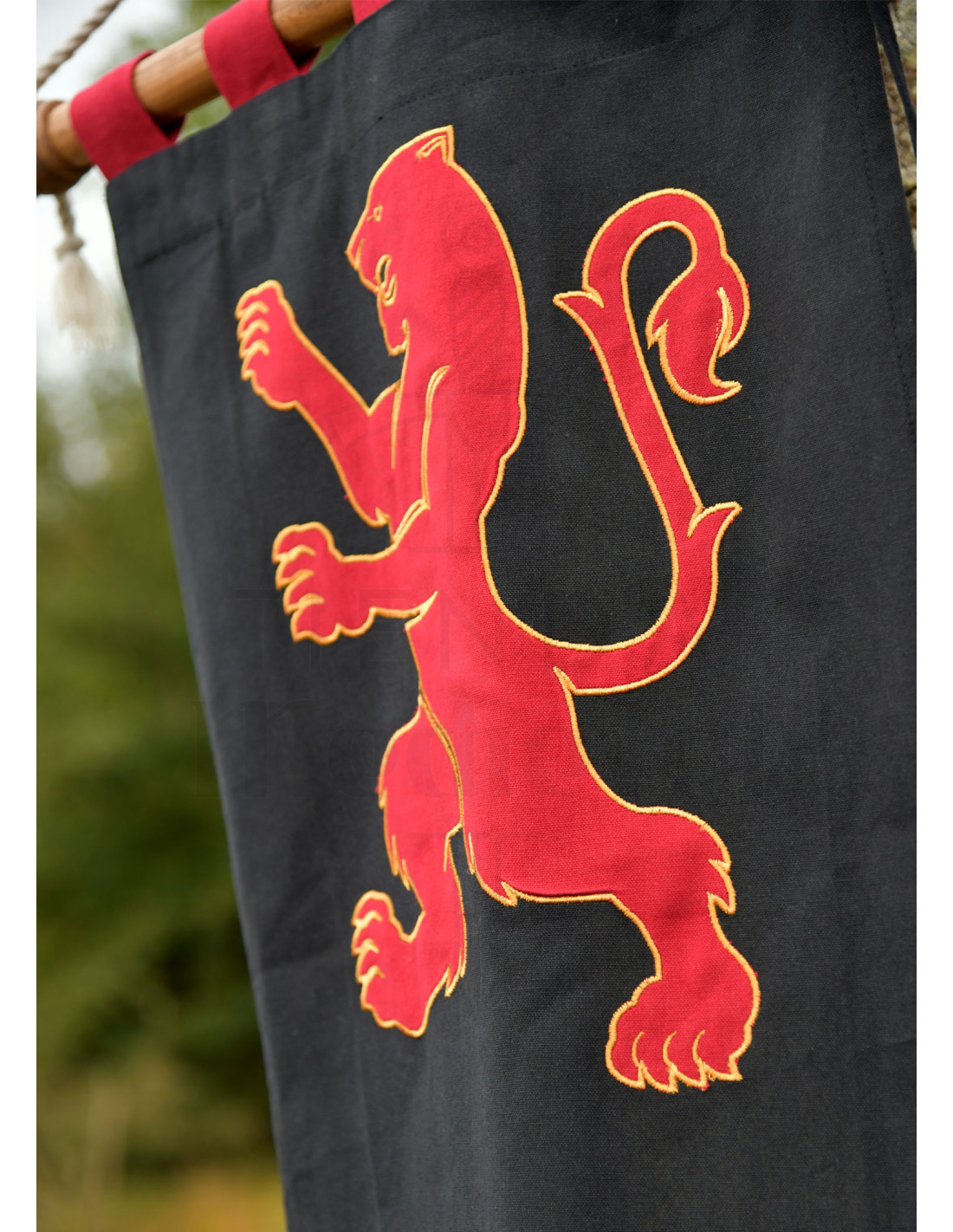 Købseord: køb Middelalderbanner med løvedesign, sort-rød, ideelt til tematiske dekorationer og historiske rekreationer.