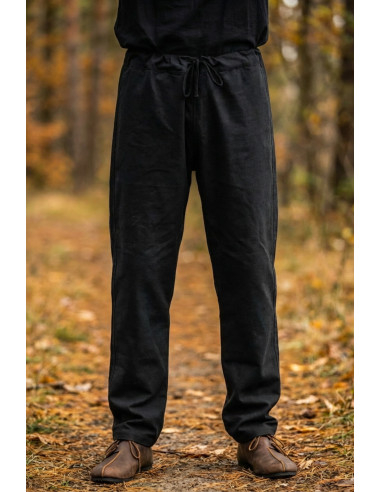 Designet af Middelalderbukser model Peter, sort tilbyder en klassisk silhuet, der tilpasser sig dit tempo: en lige pasform, der tillader fri bevægelse, og en elastisk adjusterbar talje, der gør det nemt at tilpasse tøjet lynhurtigt og holde komforten i timevis. Fornemmelsen af at være godt klædt, uden stivhed, kan mærkes både på et renæssancemarked og på en lang rekreativ dag.