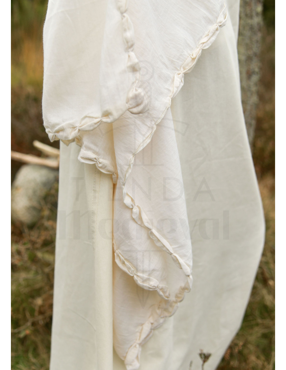 De lange trompetærmer, lavet af et finere og let gennemsigtigt bomuldsstof, tilføjer et romantisk og bevægeligt touch, med åbninger op til skulderen, der holdes med en sløjfe på armen for at regulere faldet. Den håndlavede samling ved håndleddet og de slidte kanter giver et rustikt og håndlavet udseende, ideelt for dem der søger en boheme- og autentisk æstetik. Den mørke og tynde bælte, der står i kontrast til cremetonen, fremhæver taljen og tilføjer et visuelt kontrastpunkt.