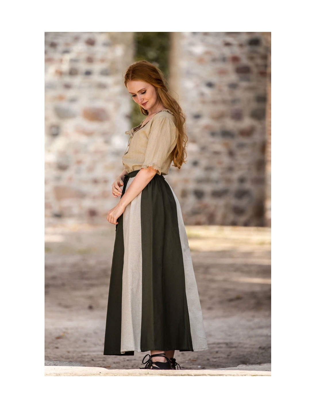 Oplev Diana-modellen middelalderskørt til kvinder, en beklædningsgenstand, der vil tage dig til riddernes og slottenes tid. Lavet med en kombination af bomuld og hør, denne nederdel tilbyder dig enestående komfort. Derudover er dens enkle snit i en naturlig grøn-hvid farve perfekt til enhver lejlighed.