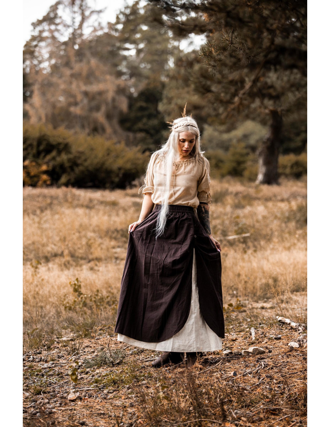 Medieval nederdel model Elise Brun-Natur er designet til den, der søger en blanding af klassisk elegance og ægte komfort. Dens design med to lag udnytter kontrasten mellem indre og ydre for at skabe en drapering med bevægelse, der følger dine bevægelser og løfter silhuetten uden besvær. Den sidelange finish med knapper gør det muligt at tilpasse volumen og fald til det look, du ønsker, fra et mere sobert udseende til et mere teatralsk.