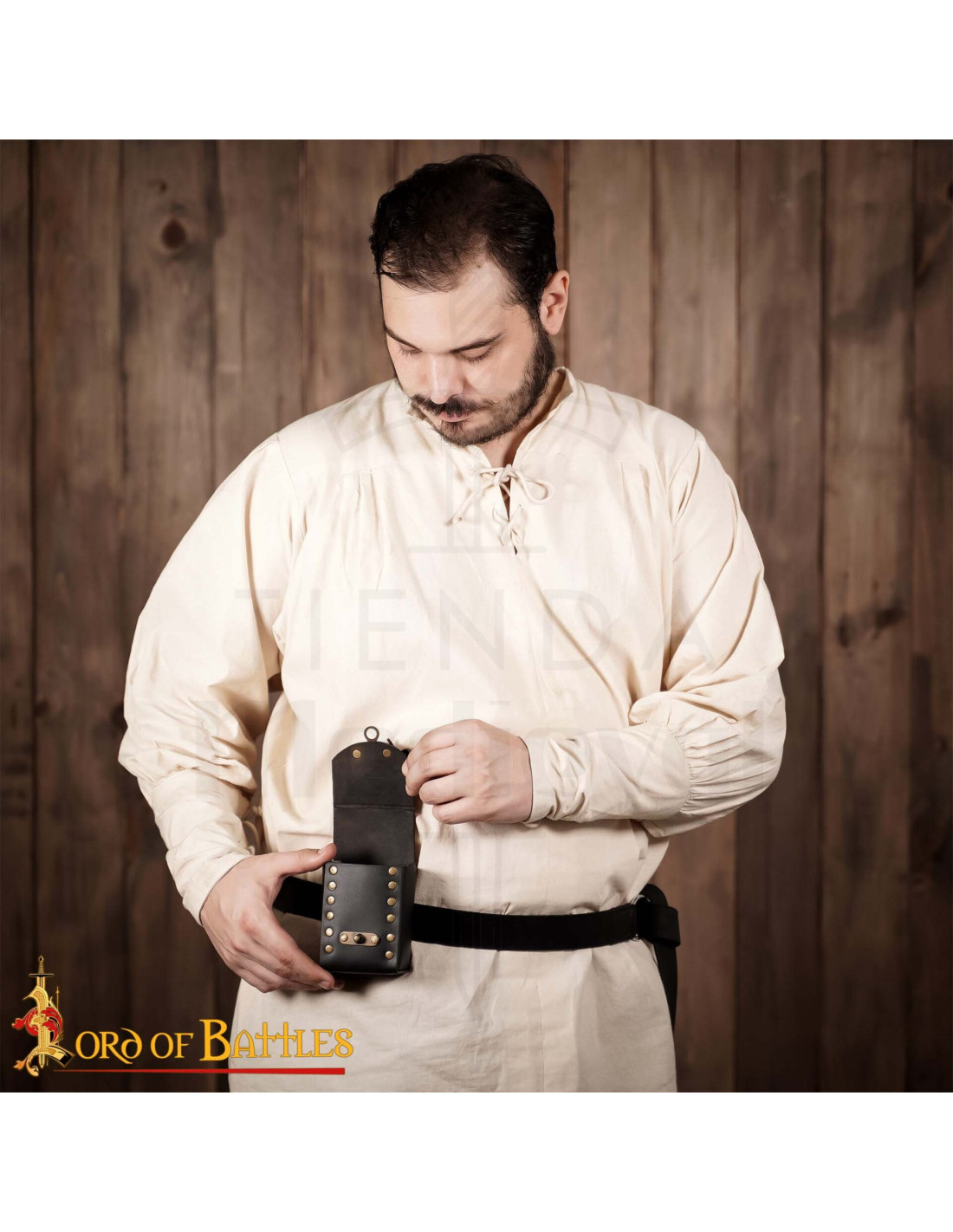 Er du på udkig efter et praktisk tilbehør med et historisk præg til at bære dine mest essentielle genstande? Denne lille sorte læderpung, inspireret af de klassiske bæltepunge fra det 14. og 15. århundrede, er lige det, du har brug for. Fremstillet af ægte 3 mm tykt læder, tilbyder den en robust og holdbar struktur, der bevarer sin form selv ved dagligt brug, og følger dig på eventyr eller gennem middelaldermarkeder.