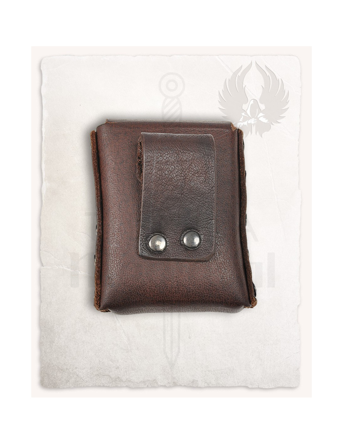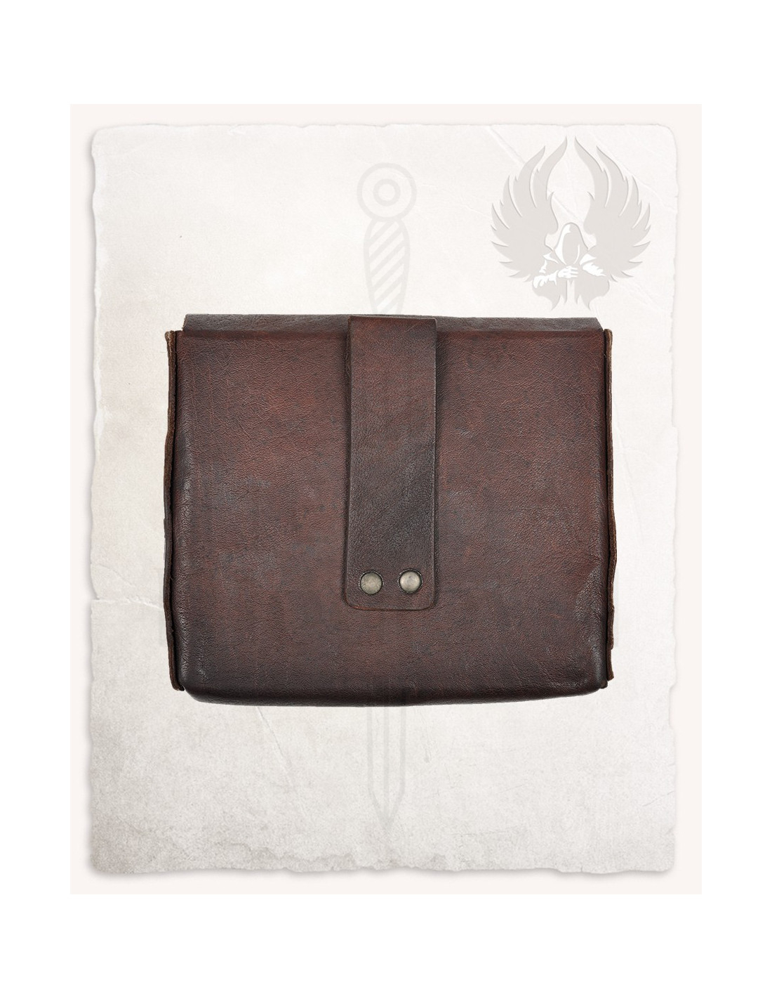 Fremstillet i brun, tekstureret læder, tilbyder denne taske holdbarhed og et klassisk udseende, der passer til enhver middelalder- eller fantasy-stil. Den rektangulære form og bløde kanter fremhæver dens enkelhed, hvilket giver dig mulighed for at tilpasse den efter din karakter eller præference uden at miste dens funktionelle karakter. Takket være dens enkle og holdbare konstruktion med nikkeleret stål i detaljerne, kan du stole på dens holdbarhed og nemhed i brug under dine eventyr eller temafester.