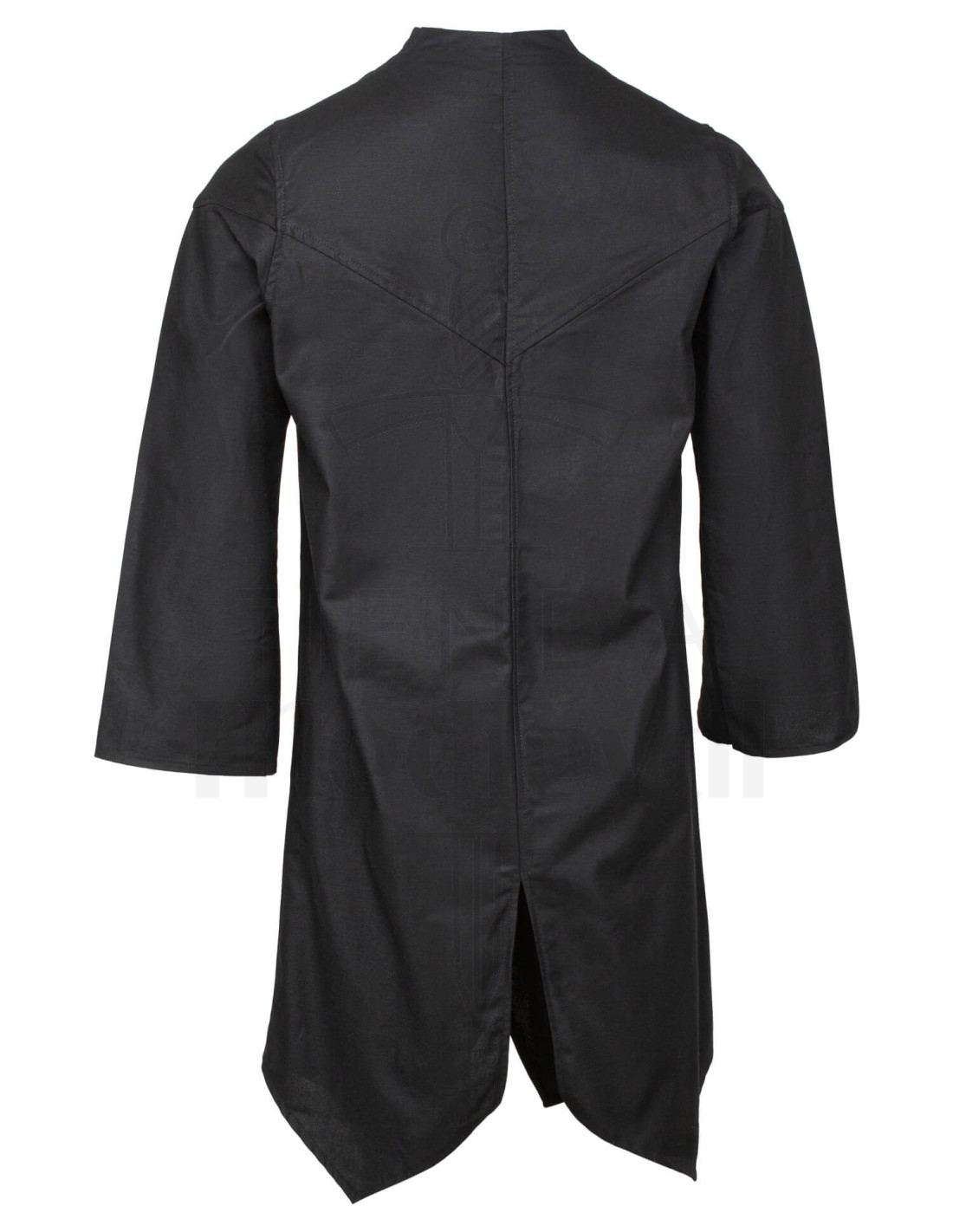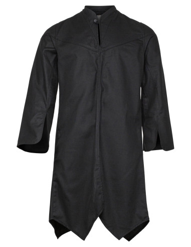 Er du på udkig efter et stykke tøj, der tager dig med til en verden af fantasi og elegance? Denne lange Arantir-model kappe i dyb sort er perfekt til at bringe mytiske karakterer som elvere, magikere eller præster til live. Dens design kombinerer enkelhed og sofistikeret elegance, hvilket får den til at skille sig ud i enhver scene. De brede, åbne ærmer giver et flydende præg og tillader fuld bevægelsesfrihed, ideelt til dramatisk gestik. Længden til midten af låret og det afslappede snit sikrer komfort og stil uden besvær, mens den bløde, høje hals med diskret knaplukning tilføjer et strejf af diskret raffinement.