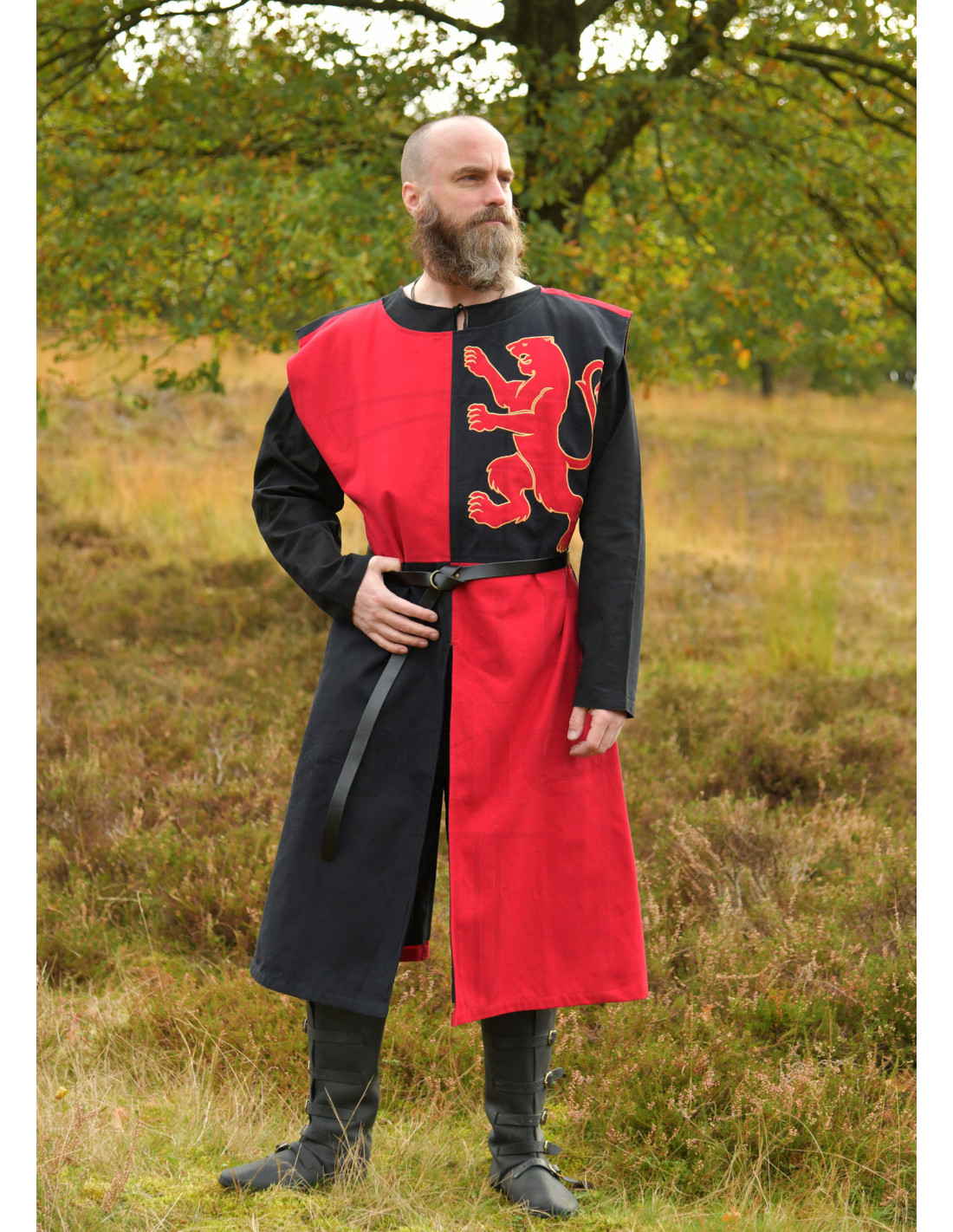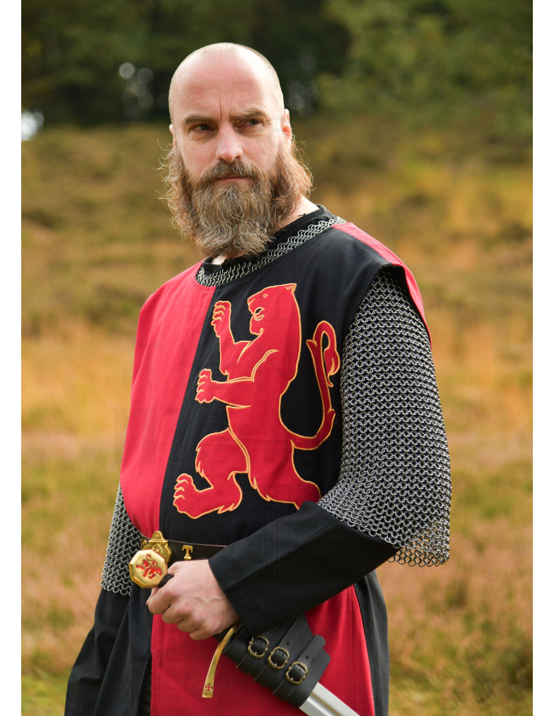 Den broderede rampende løve på højre side kombinerer røde og gyldne nuancer, hvilket giver et kongeligt udtryk, der forbinder med den historiske symbolik af autoritet og mod. Diskrete skulderpuder fremhæver silhuetten uden at begrænse bevægelsen, og den snorede halslukning muliggør en nem tilpasning, samtidig med at den opretholder det autentiske udseende af tøjet. Længden ned til knæet giver tilstedeværelse uden at hindre bevægelsen i rekonstruktioner eller aktiviteter.