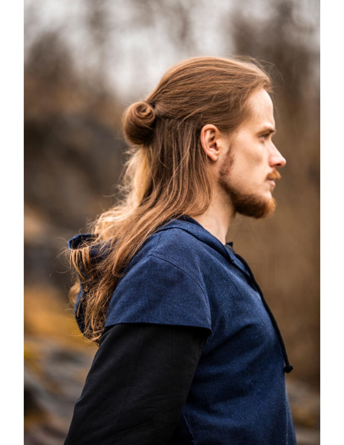 Middelalderlig bueskytte tunika model Arais, blå giver denne følelse fra første brug: en omsluttende hætte der beskytter uden at begrænse, og en overlappende V-udskæring der tilføjer karakter uden at komplicere bevægelsen. Da den er ærmeløs, tillader den frie armbevægelser, ideel til dem, der kræver smidighed og præcision i hver gestus.