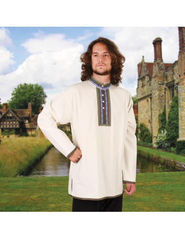 Derudover har denne skjorte en 3 cm broderet kant i folk-stil syet rundt om halsen og foran, hvilket tilføjer et strejf af klasse og elegance. Men det er ikke alt, du kan også finde matchende trim på ærmerne og forneden af skjorten, hvilket yderligere forstærker dens unikke middelalderlige look.