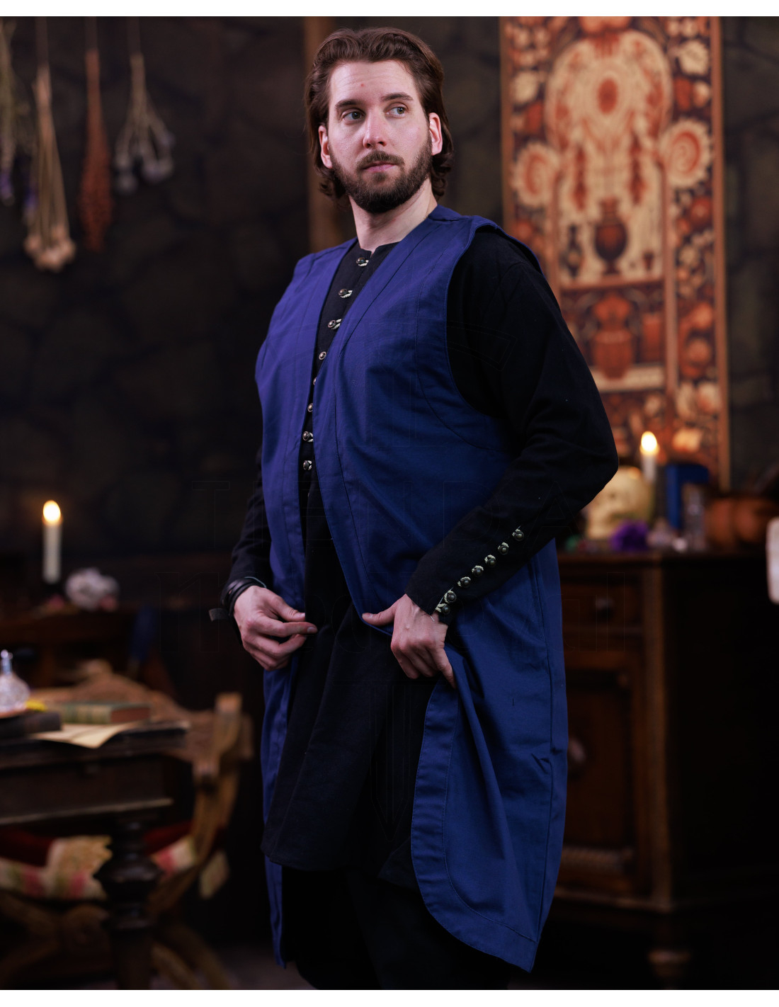 Part of the Sorcery series, this garment connects with the imaginations of wizards, clerics, and scholars, adding credibility to characters belonging to fantasy universes or historical recreations. For those looking to buy the Lang middelaldersk vest model Oberon, farve bl5, it is a choice designed for long sessions in reading rooms, laboratories with cold drafts or evenings by the fire.