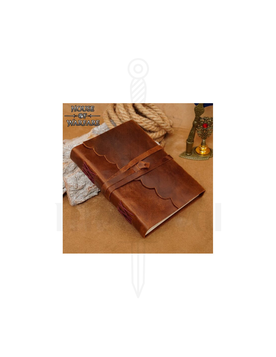 Det brune læderomslag, håndlavet, giver en varm og autentisk tilstedeværelse, perfekt for dem, der værdsætter omhu. Den bølgede kant på forsiden tilføjer et dekorativt detalje, der fanger øjet, mens den tynde rem, der bindes rundt, holder indholdet sikkert, klar til at følge dig uden at åbne sig ved et uheld.