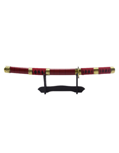 Den praktiske basis katana Shusui fra Zoro i animeen One Piece er en uofficiel replika, der er et must-have i enhver fans samling af serien. Med en længde på 105 cm skiller denne katana sig ud med sit skarpe blad i kulstoffer stål AISI 1045, afsluttet i sort, med et iøjnefaldende rødt savtakket design, der giver den et unikt og karakteristisk udseende.