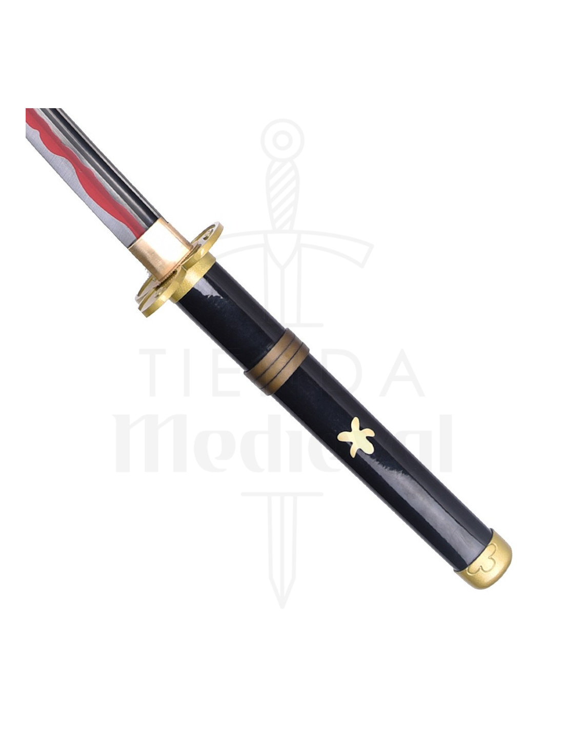 Dets stålblad har et rødt mønster på klingen, hvilket tilføjer et distinkt og visuelt slående præg, selvom det ikke er skærpet, og kun egnet til udstilling. Det sorte håndtag, dekoreret med et rødt silkesløjfe og et gyldent symbol, afspejler karakterens æstetik og aura af magt. Den gyldne metal tsuba og træskeden med gyldne detaljer og røde frynser giver et elegant og sofistikeret finish.