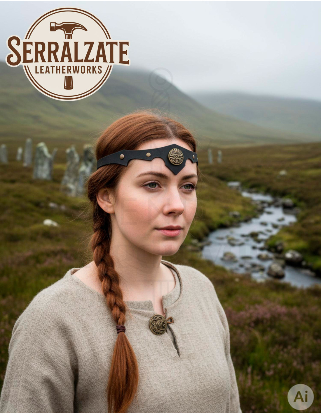 Designet beskytter panden med den delikate elegance, som det metalliske ornament med keltiske motiver og nitter tilføjer, og fremhæver detaljer, der afspejler historie og tradition. Ideel for personer, der kan lide tilbehør med karakter og ånd. Justeringen bagpå, med en lædersnor, sikrer perfekt komfort og en personlig pasform, hvilket gør den nem at bruge ved forskellige lejligheder.