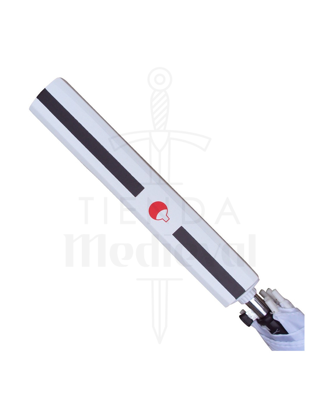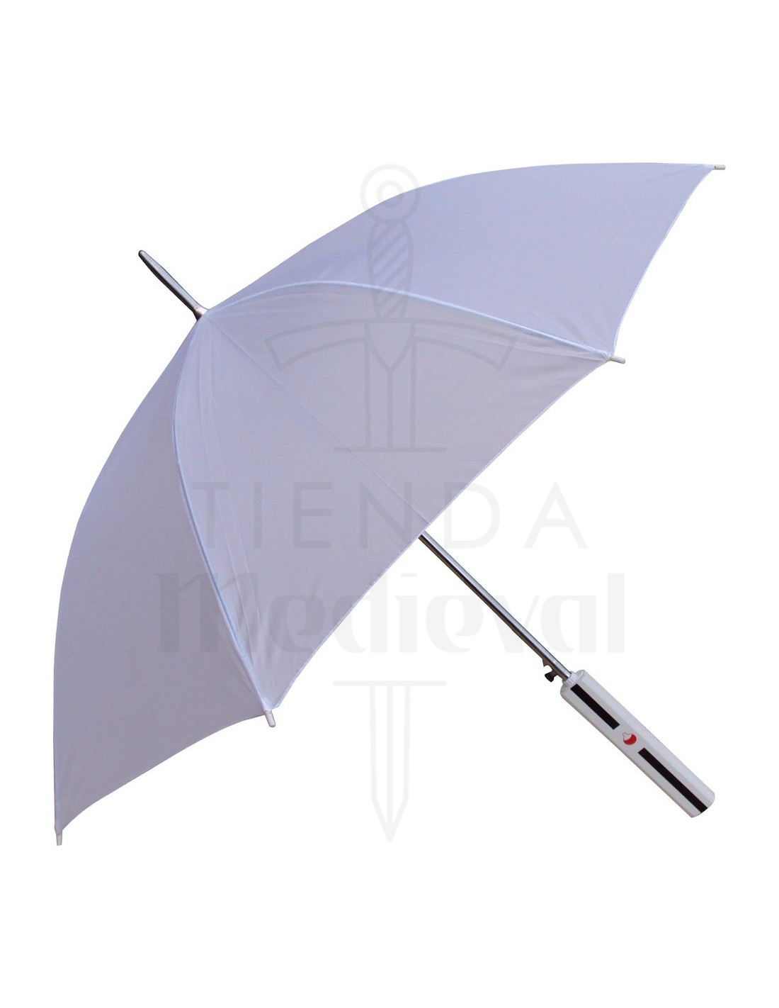 Dets katana-formede håndtag, inspireret af Sasuke Uchiha's legendariske våben, er lavet af træ, hvilket giver et behageligt og ægte greb, der er værdigt for en ninja. Metalstrukturen, med en robust base og en guard, der simulerer klingen af katanaen, sikrer holdbarhed og stabilitet. Derudover gør dens automatiske klik-åbning det nemt at bruge, så du kan åbne den med et enkelt tryk, og altid være klar til al slags vejr.