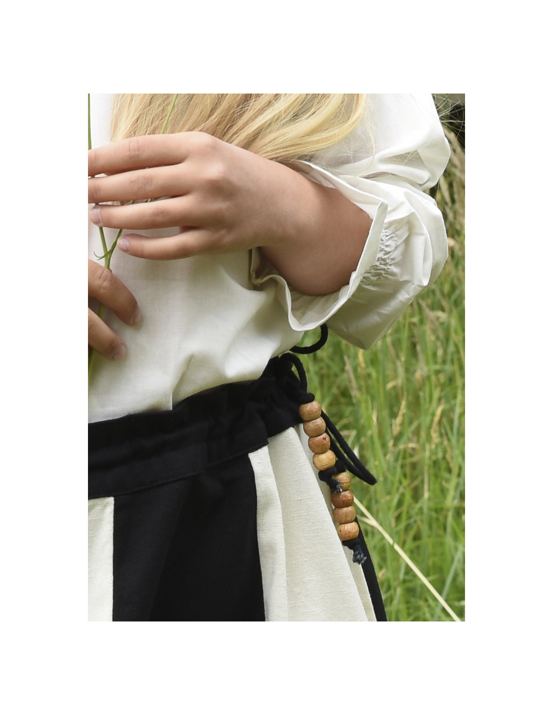 Denne smukke nederdel er lavet af 100% bomuld, hvilket gør den blød og åndbar, perfekt for piger at bevæge sig frit under deres middelalderlige eventyr. Derudover har den en talje med sort snøre, som gør, at den kan tilpasses perfekt til pigens størrelse for at garantere hendes komfort.