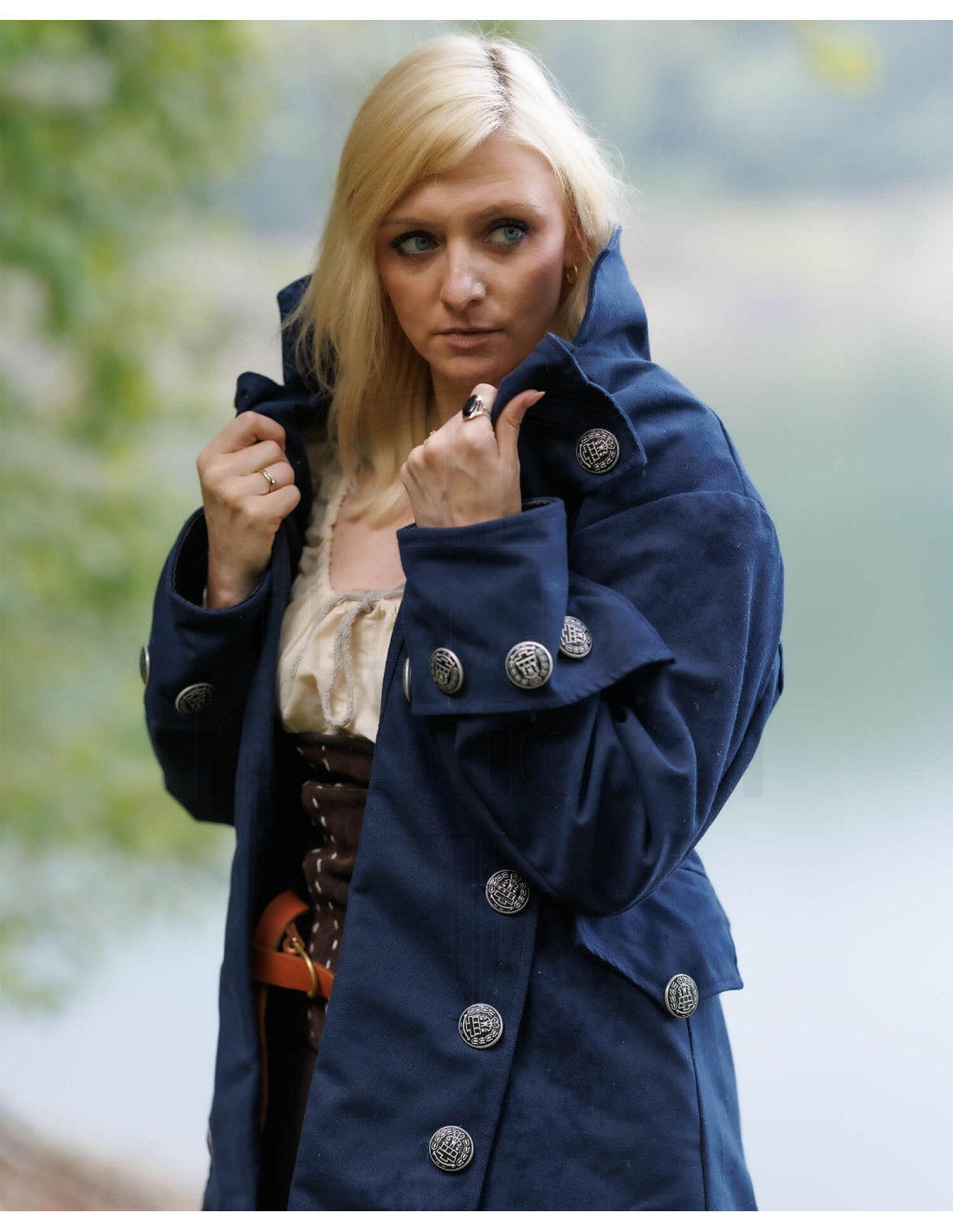 Forestil dig at bære et outfit, der indfanger essensen af det 18. århundrede, inspireret af fremtrædende figurer og søfartens mytologi, men tilpasset til din nutidige stil. Billedet af kvinden med en lignende frakke viser, hvordan denne jakke kan forvandle dit look i en scene fyldt med historie og fantasi, og fremhæve din dristige og karakterfulde personlighed.