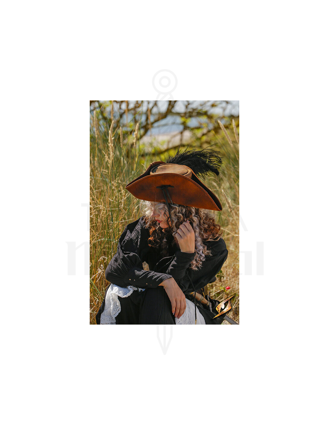 Fås i sort for et mere autoritært udseende, perfekt til kaptajner eller duelister, og i brun for en ældet finish, der fremkalder år til søs eller gamle kampagner. Du kan gøre det endnu mere personligt med fjer, bånd eller blot lade det beholde sin naturlige, slidte finish, der matcher din personlighed og æstetik.