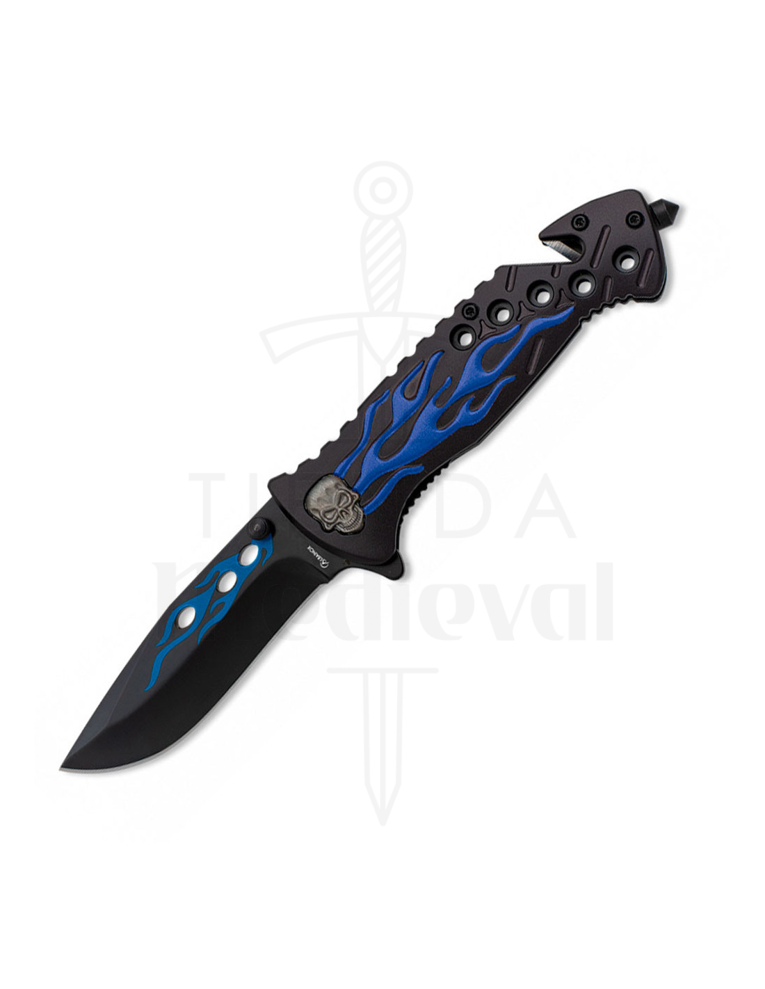 Mød enhver situation med stil og beslutsomhed med Blue Flaming Skull Rescue Knife fra Albainox! BLUE SKULL er ikke kun et pålideligt værktøj, men også et modigt udtryk for din eventyrlystne personlighed.