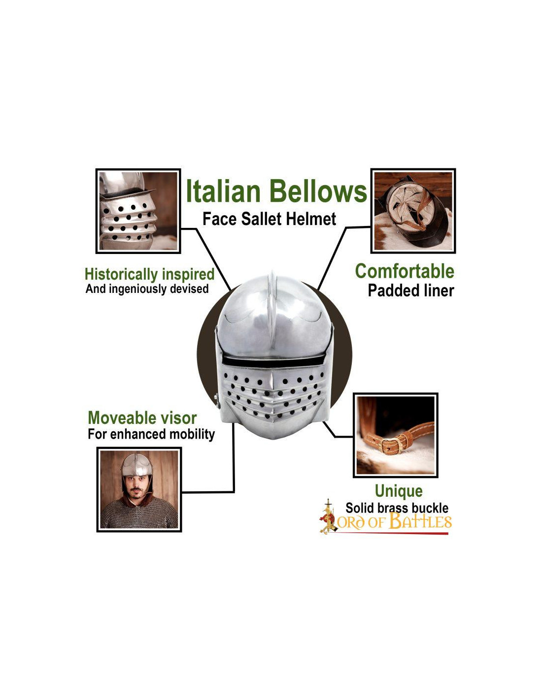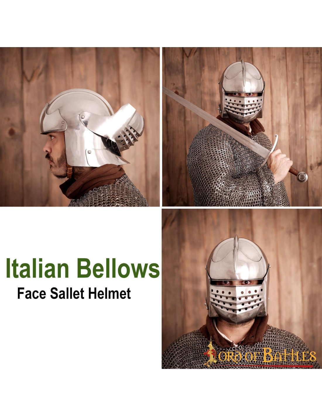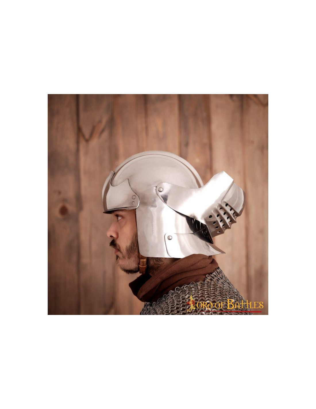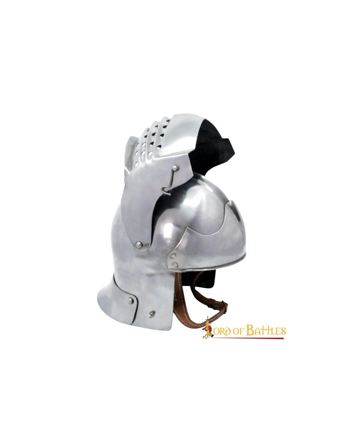 Leder du efter en alsidig hjelm til din næste kamp Direkte inspireret af en renæssance-original fra Wallace Collection (London), for nylig omdateret til omkring 1500. Vores bælghjelm viser sig at være en meget praktisk hjelm, der tilbyder en interessant kombination af fremragende synlighed og god beskyttelse.