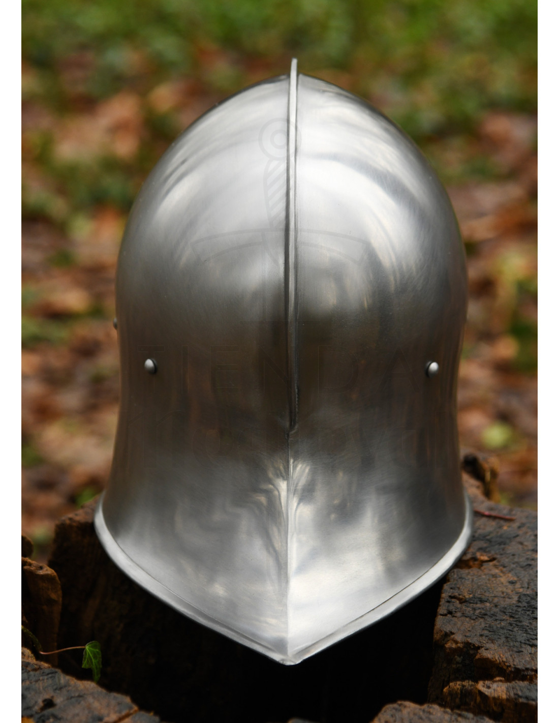 Med en poleret overflade, der fremhæver dens sølvfarvede metalfinish, skiller denne Sallet-hjelm sig ud med sin karakteristiske centrale kam, der tilføjer stil og robusthed, mens dens omhyggeligt buede kant giver ekstra beskyttelse uden at gå på kompromis med bevægeligheden. Den rektangulære åbning foran sikrer et optimalt synsfelt, hvilket er afgørende for at holde dig vågen og sikker i kamp eller ved historiske arrangementer.