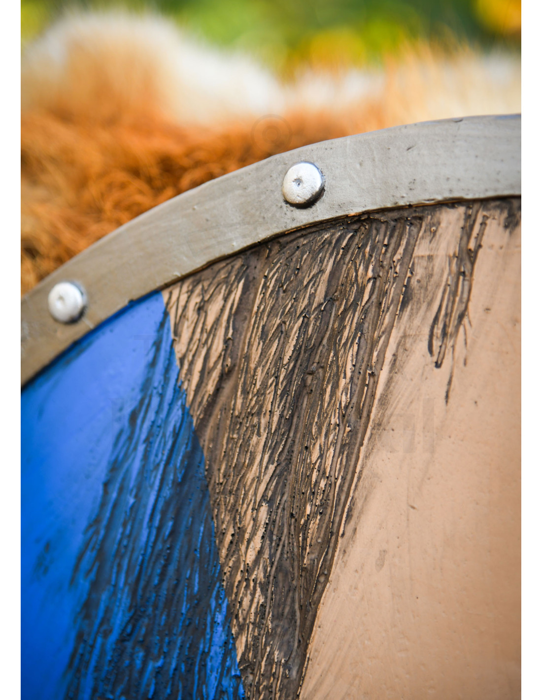 Dets rustikke æstetik og synlige åre giver indtryk af gammelt træ, mens den blå og beige finish, opdelt i fire sektioner, giver karakter og tilstedeværelse i enhver scene. Den metalring med nitter og den buede centrale beskyttelse bekræfter indtrykket af udstyr smedet til kamp, mens den også sikrer den lethed, du har brug for under aktion.