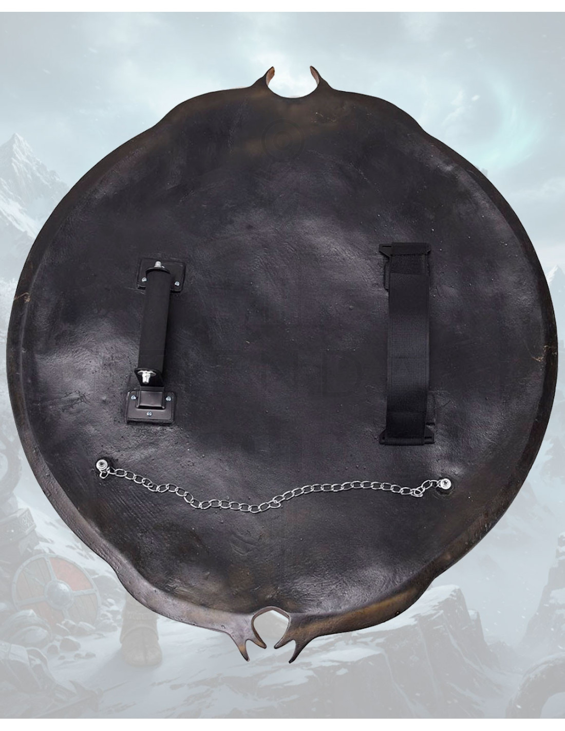 Dette dekorative ikke-officielle skjold af Kratos, God of War giver denne episke tilstedeværelse uden besvær, takket være dets cirkulære design med detaljeret relieff, der kombinerer skæl- eller fjerformede motiver og flettede mønstre, der minder om gammel håndværk. Den slidte gyldne finish fremhæver hver kontur og skaber skygger og glans, som får relieffet til at skille sig ud fra enhver vinkel, mens de kryds og strukturer, der går igennem, tilføjer et dynamisk og symbolsk karakter.