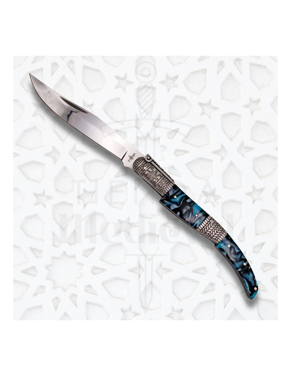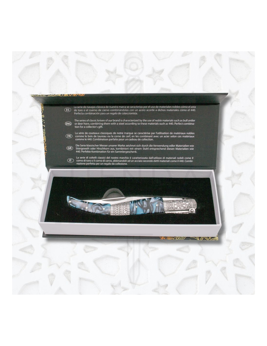De dekorative detaljer, inspireret af de klassiske spanske knive fra det 19. århundrede, tilføjer et præg af distinction, der gør den til et unikt stykke. Hver linje og hver gravering er omhyggeligt tænkt for at give dig en enestående brugsoplevelse. Desuden er fjederen og den dekorerede lås et vidnesbyrd om omhu i fremstillingen.