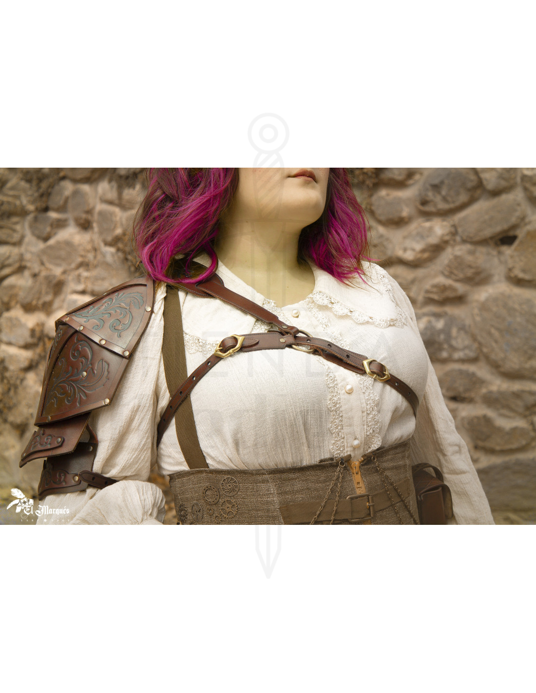 Har I nogensinde tænkt på, hvordan en ridder fra 'Carnival Row' kunne stråle med denne skulderbeskytter? Eller måske protagonisten fra 'Dishonored', der glider hen over tagene, iført dette unikke tilbehør, der ikke kun er æstetisk, men også et symbol på ædle dyder og mod. Dekorationen af barok blomster, der er indgraveret på overfladen, tilføjer ikke kun et kunstnerisk præg, men giver også genklang af sofistikering fra svundne tider og den steampunk-stil, der fascinerer så mange.